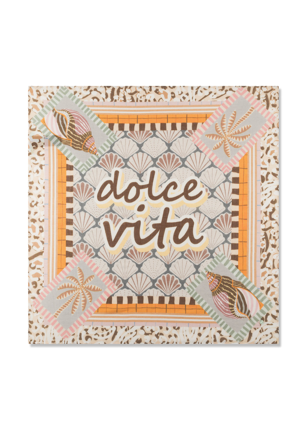 Das Bandana Tuch „Dolce Vita“ überzeugt mit einem stilvollen Mustermix und harmonischen Naturtönen. Der markante „Dolce Vita“-Schriftzug sowie grafische und maritime Elemente setzen moderne Highlights und unterstreichen den besonderen Charakter. Der hochwertige Baumwoll-Modal-Mix sorgt für einen weichen Griff, leichten Tragekomfort und einen feinen, edlen Fall. Mit seinem Format von 60 x 60 cm lässt sich das Damen Halstuch vielseitig tragen – als klassisches Bandana, im Haar oder als stilvolles Accessoire an der Tasche.