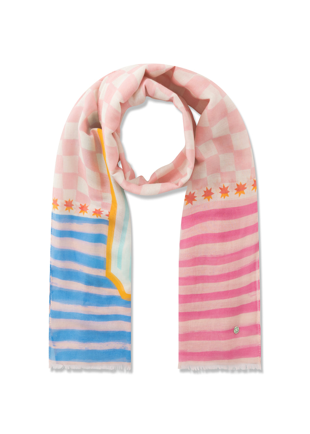 Mit seinem farbenfrohen Mustermix bringt dieser leichte Baumwollschal sommerliche Dynamik in den Look. Ob locker um den Hals oder lässig über die Schultern getragen – ein unkompliziertes Styling-Detail für Frühling und Sommer.
