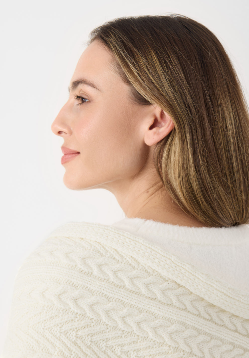 Dieses gestrickte Dreieckstuch aus einem wärmenden Wollmix zeigt sich in klassischem Weiß mit Zopfmuster. Die strukturierte Oberfläche verleiht dem Design eine winterliche Note, während der Materialmix für eine angenehme Wärme sorgt – ideal für stilvolle Auftritte an kalten Tagen.