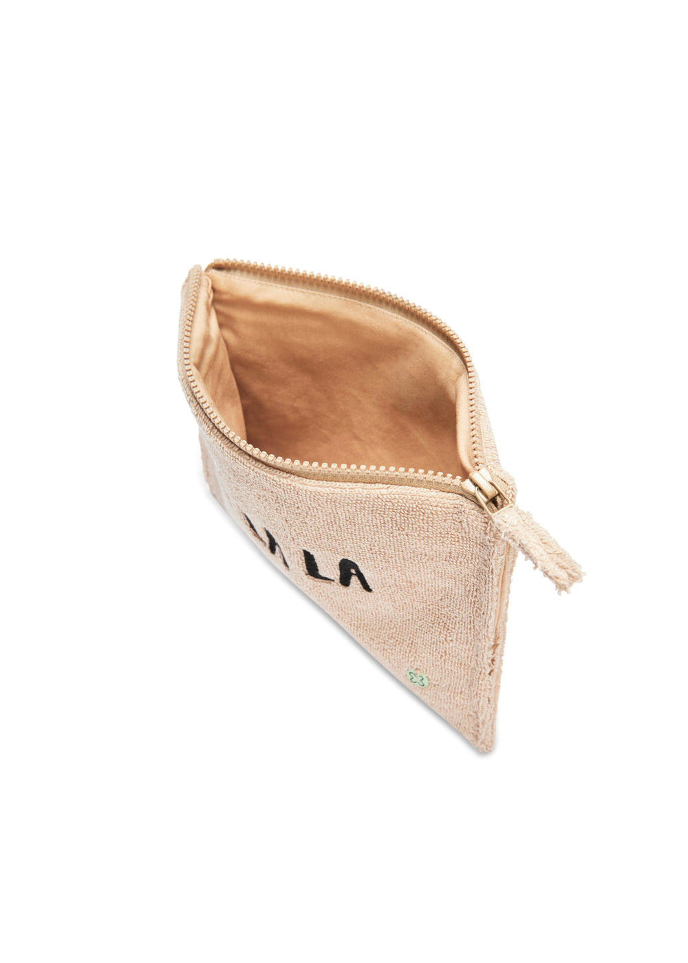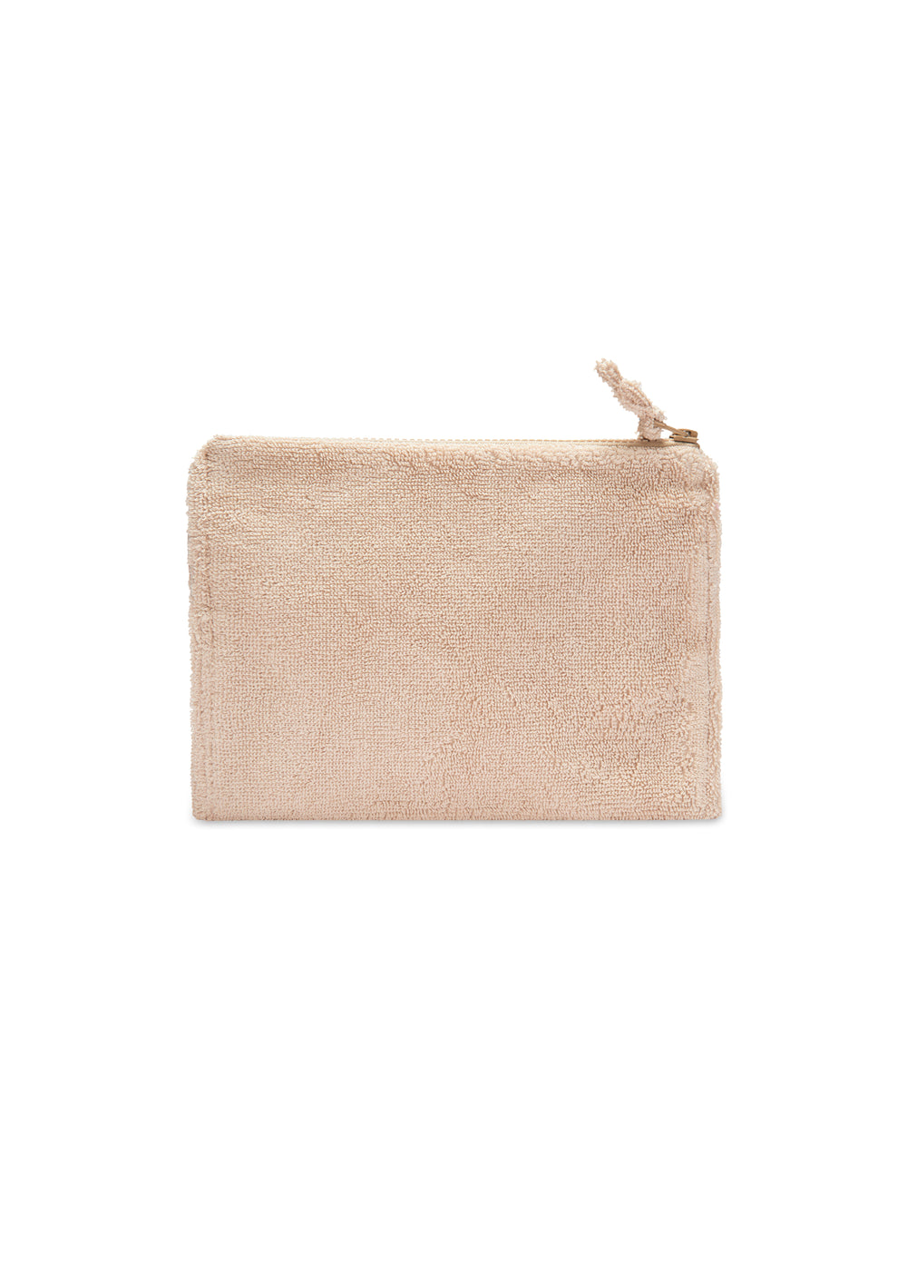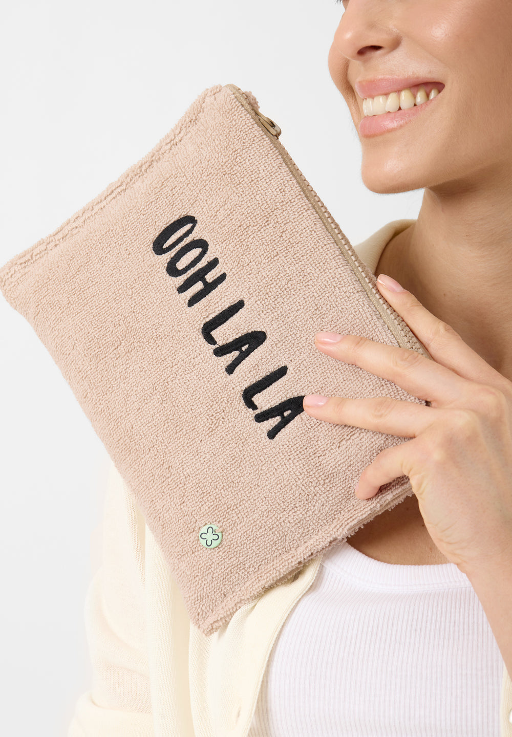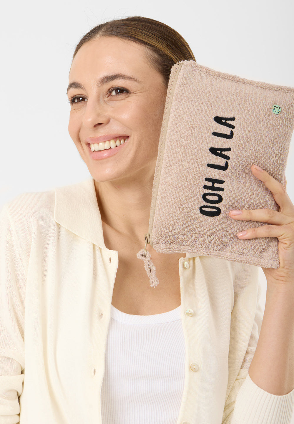 Die Kosmetiktasche aus Baumwoll-Frottee bietet eine angenehme Haptik und ist zugleich strapazierfähig. Die Schriftzug-Stickerei verleiht dem Design eine persönliche, liebevolle Note. Dank ihres kompakten Formats eignet sie sich ideal für Beauty-Essentials zu Hause oder auf Reisen.