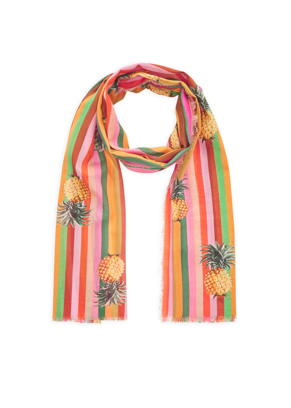 Dieser leichte Schal aus reiner Baumwolle sticht mit seinem Streifen-Design und den Ananas-Motiven ins Auge. Die luftige, angenehm weiche Qualität sorgt für ein komfortables Tragegefühl an warmen Tagen. Locker umgelegt oder lässig gebunden setzt er einen frischen Akzent im Sommerlook.