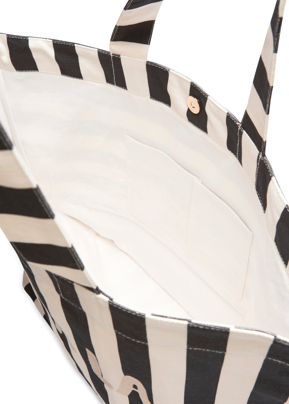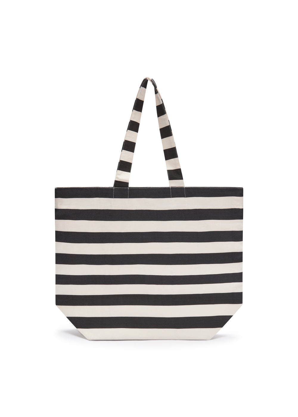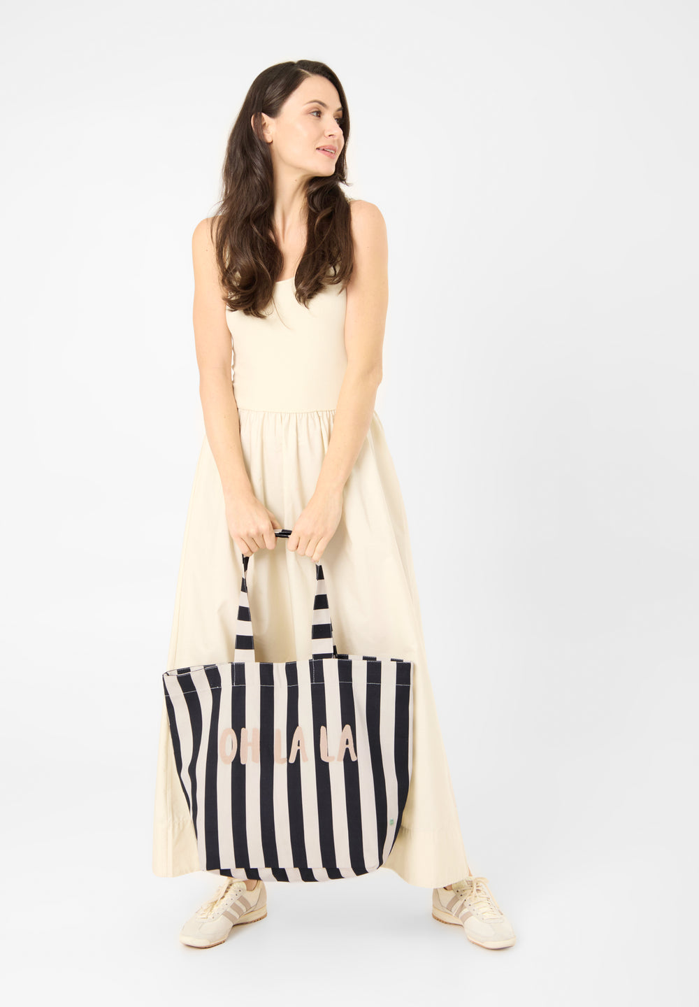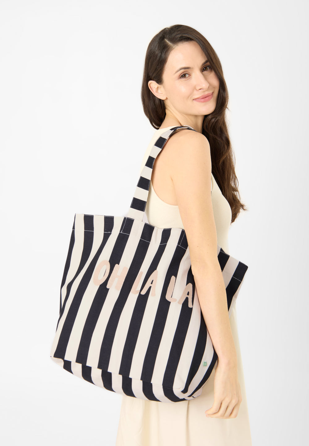 Dieser Shopper aus robustem Canvas kombiniert ein klassisches Streifenmuster mit charmanter "OH LA LA"-Stickerei. Die langlebige Qualität hält dem Alltag mühelos stand, während das großzügige Format ausreichend Platz für Einkäufe, Strandutensilien oder Reise-Essentials bietet