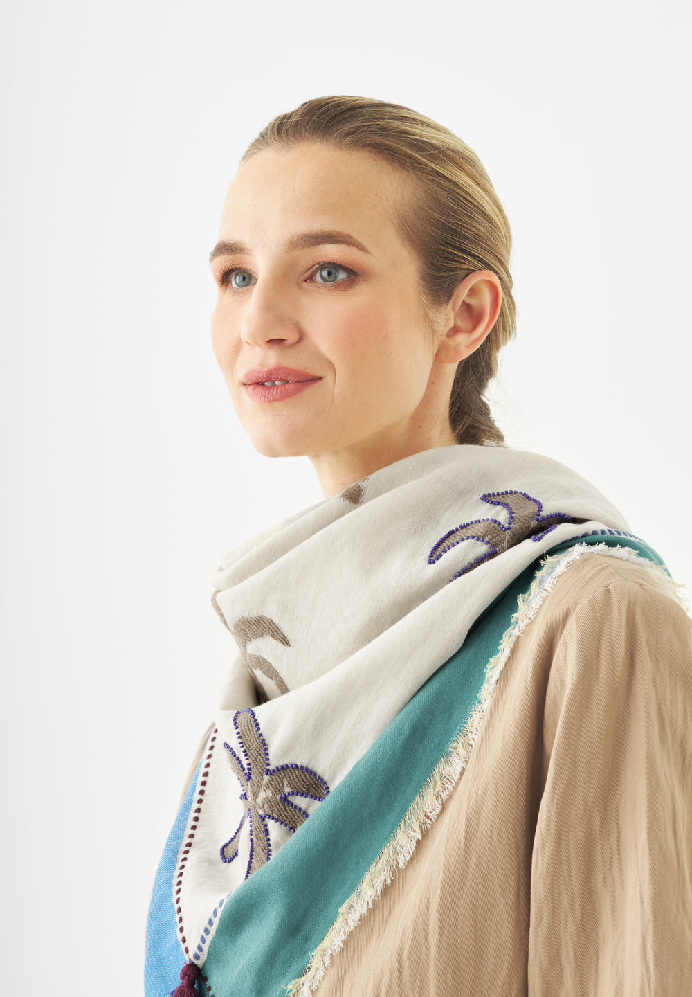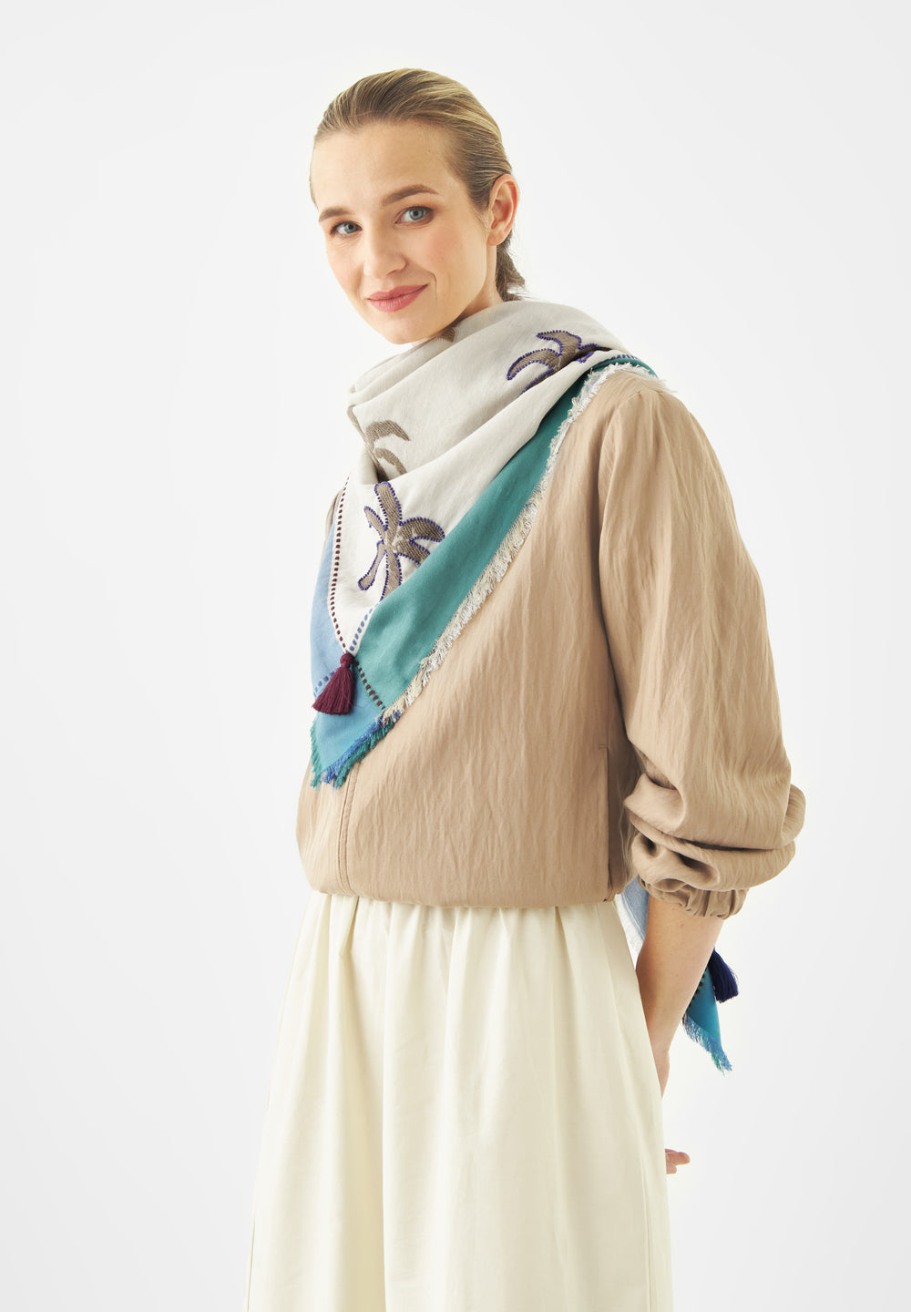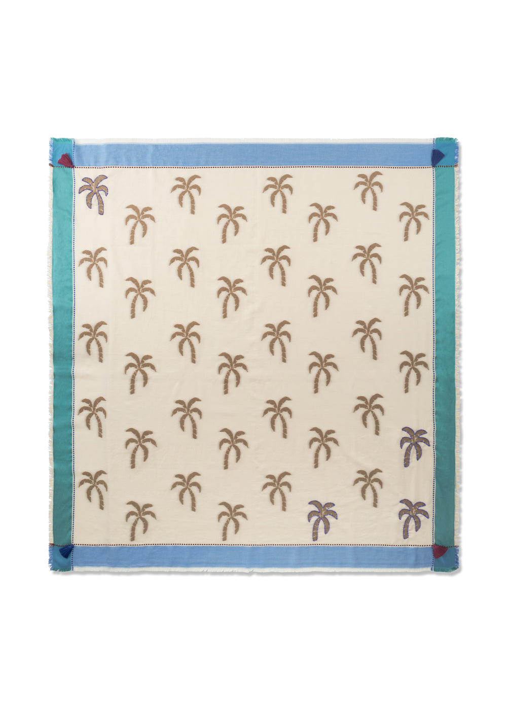 Dieses stilvolle Tuch begeistert mit allover Palmenmotiven und feinen Perlenstickereien. Sommerlich-frische Blautöne im Rahmen treffen auf warme sandige Natur-Nuancen - eine perfekte Balance of Colors. Der Baumwollanteil sorgt für ein natürliches Tragegefühl, Modal für fließende Leichtigkeit, Polyacryl für weiche Geschmeidigkeit und Wolle für angenehme Wärme – ideal für kühlere Tage. Die Jacquard-Weberei verleiht dem Design Struktur und kontrastreiche Farben.