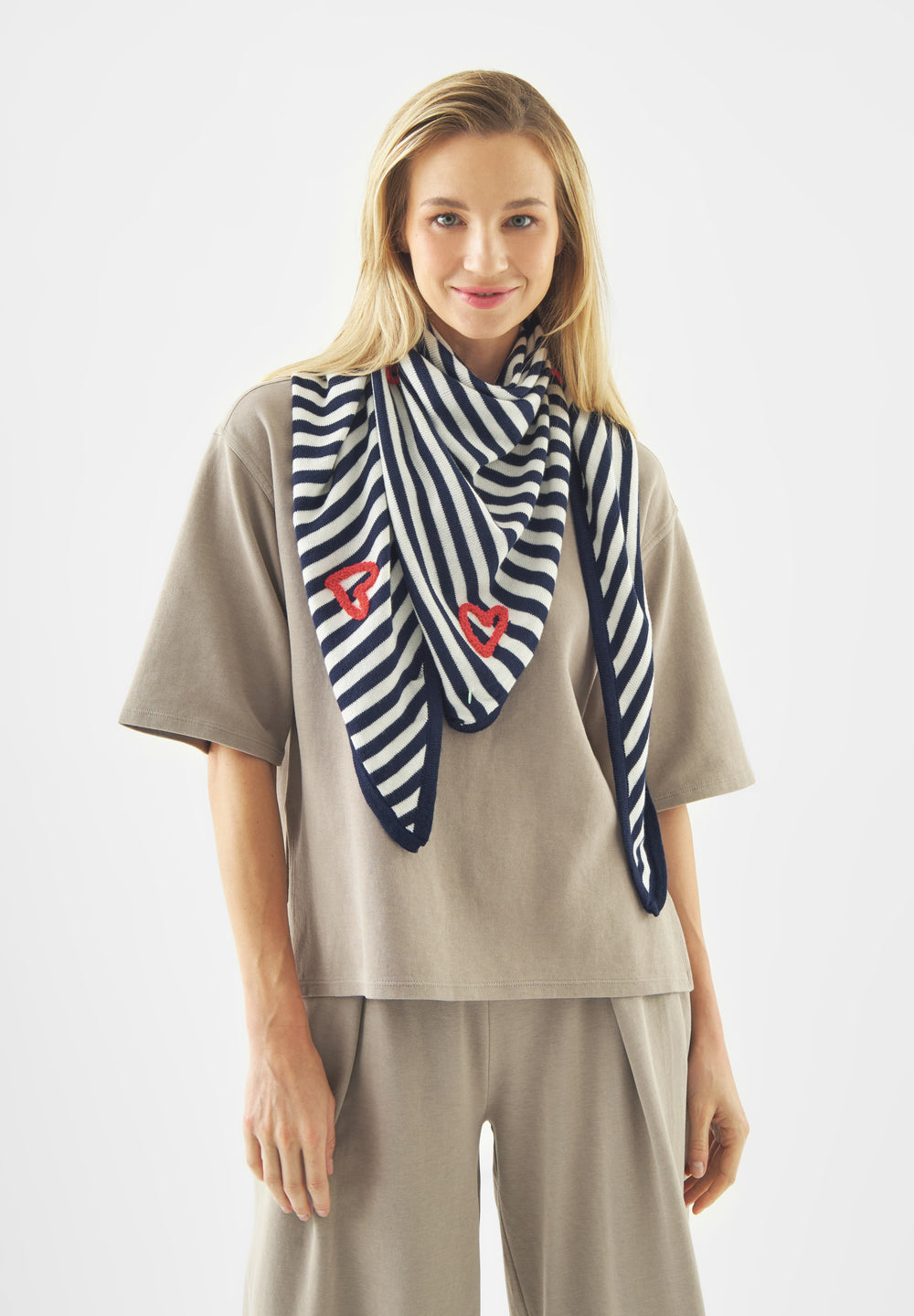 Der Frühling kommt – Zeit für leichte Tücher und Mützen. Dieses Dreieckstuch plus passende Mütze aus unserer Strick-Kollektion vereinen Komfort und coolen Style. Die Baumwoll-Polyacryl-Mischung sorgt für weichen Griff, angenehme Wärme und eine moderne Optik. Die Herz-Stickerei setzt einen charmanten Akzent – perfekt für die Übergangszeit.