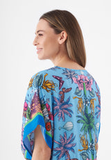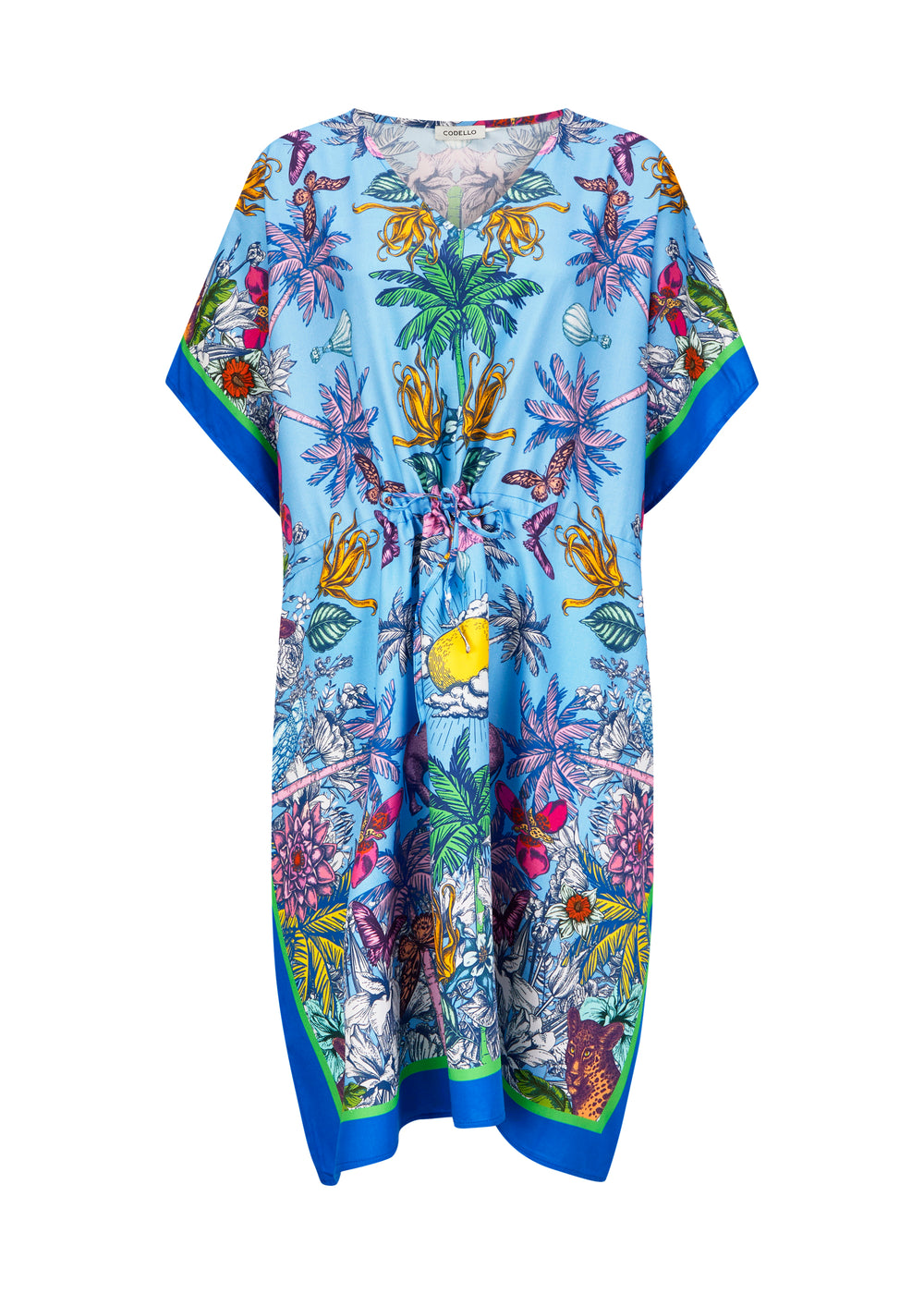 Vom Beach direkt in die Bar? Das funktioniert. Einfach unsere luftige Tunika mit exotischem Dschungel-Muster über den Bikini ziehen, eine coole Beach Bag und schicke Sandalen dazu – fertig ist dein Look. Die Tunika ist aus Viskose gefertigt, hat einen V-Ausschnitt und kann mit einem Tunnelzug in der Taillenweite verstellt werden. Viskose ist zart und weich, fällt fließend und hat einen schönen matten Glanz.