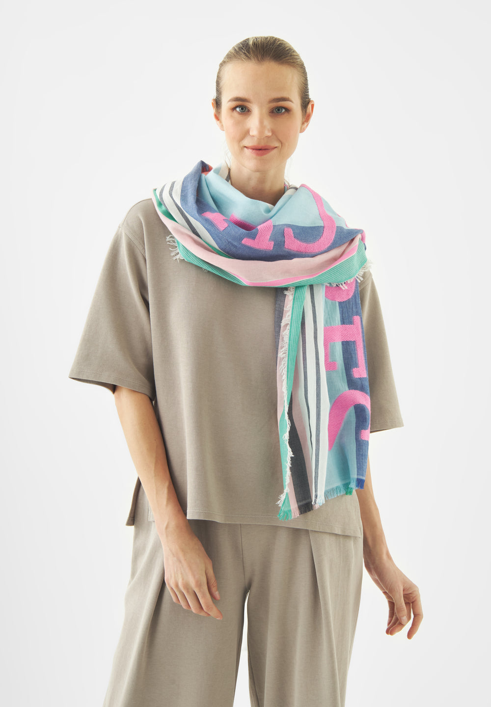 Ein Sommertag am Meer, salzige Luft, ein bisschen Farbe im Spiel. Genau dieses Gefühl fängt dieser Schal ein. Der softe Baumwollmix trifft auf ein Typo-Design in Aqua, Blau, Rosé und Grün – grafisch, modern, mit Urlaubsenergie. Ein Key-Piece für sommerliche Looks.
