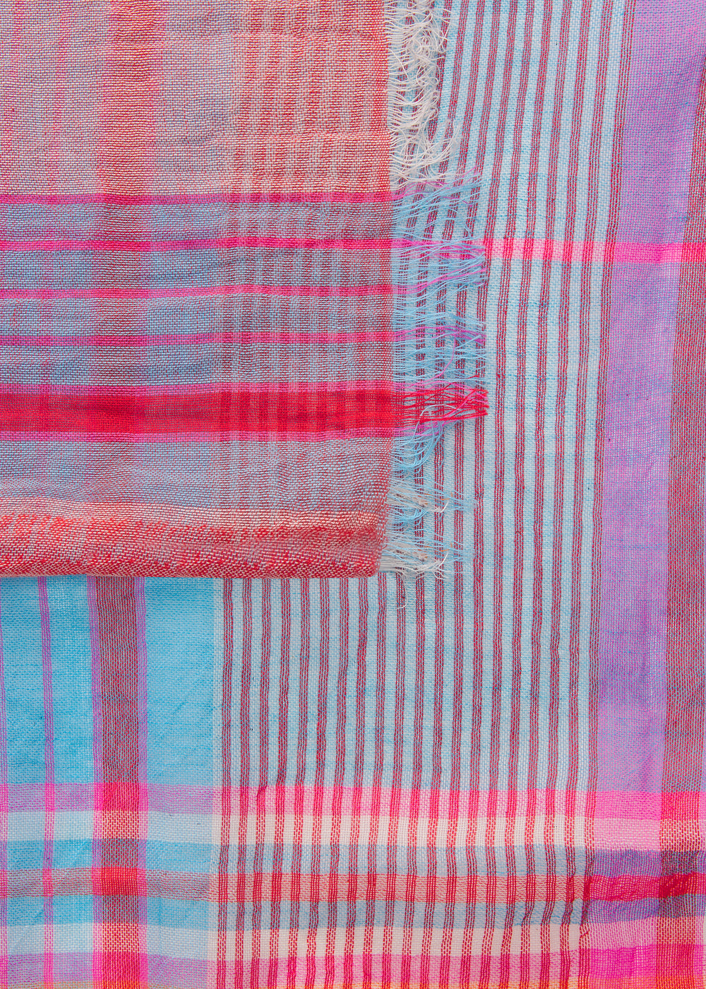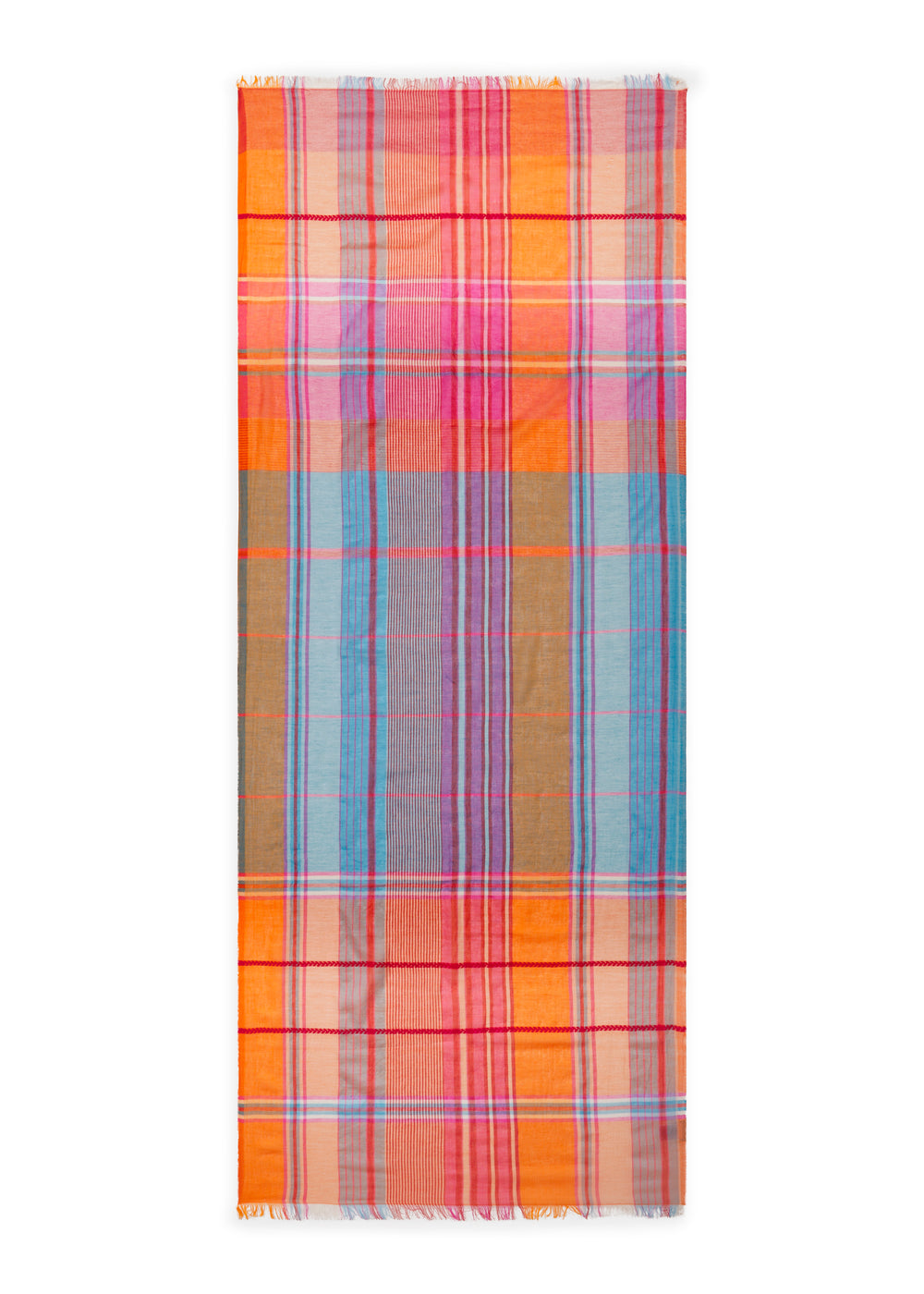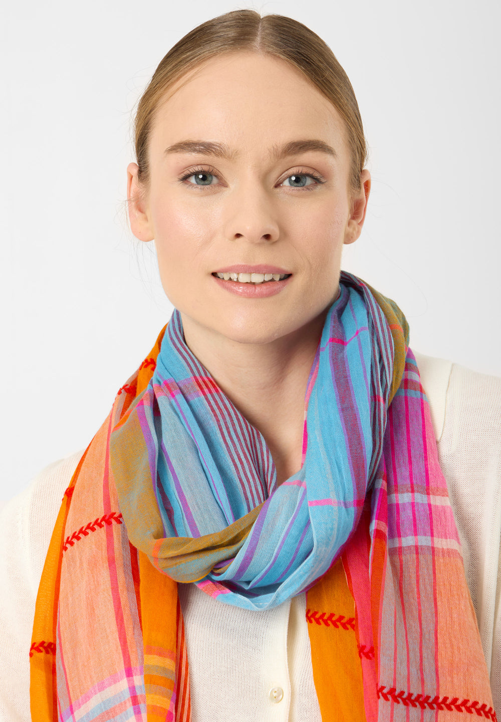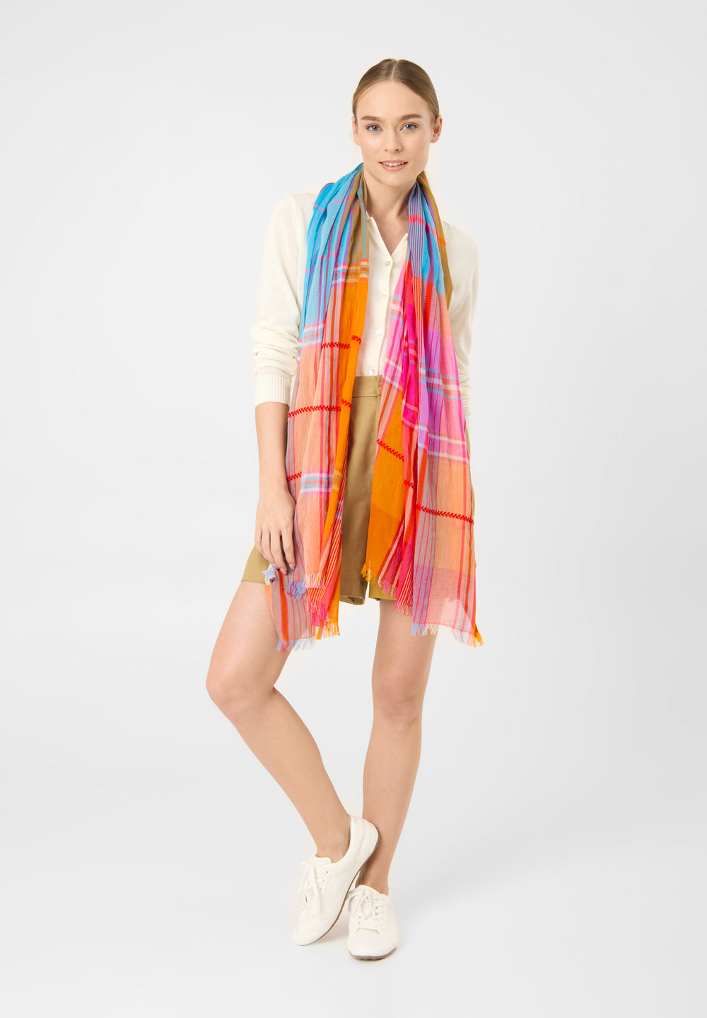 Dieser Schal aus Baumwollmischung ist in einem farbenfrohen Karomuster gewebt. Die angenehm weiche Qualität sorgt für hohen Tragekomfort und eine luftige Leichtigkeit.