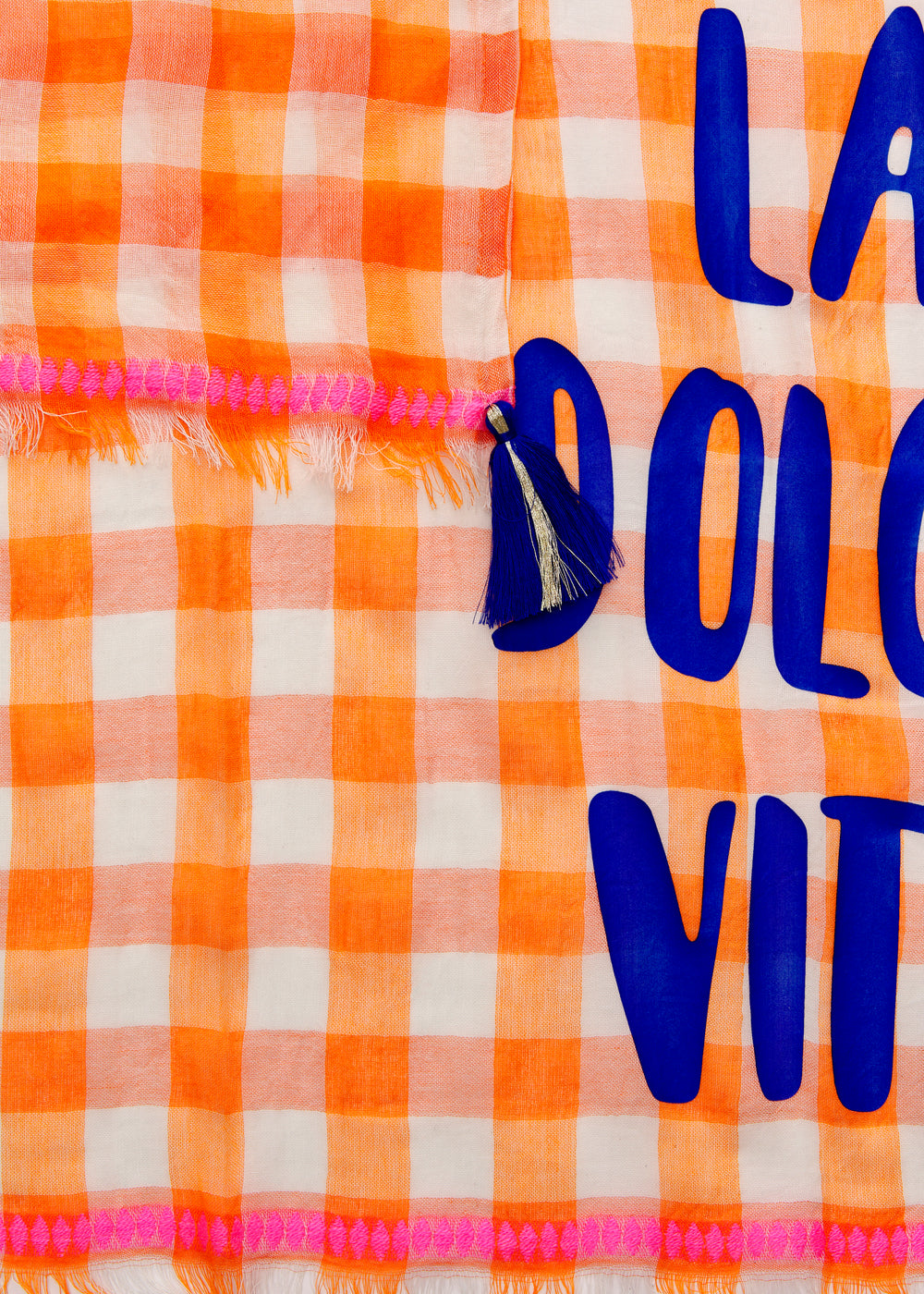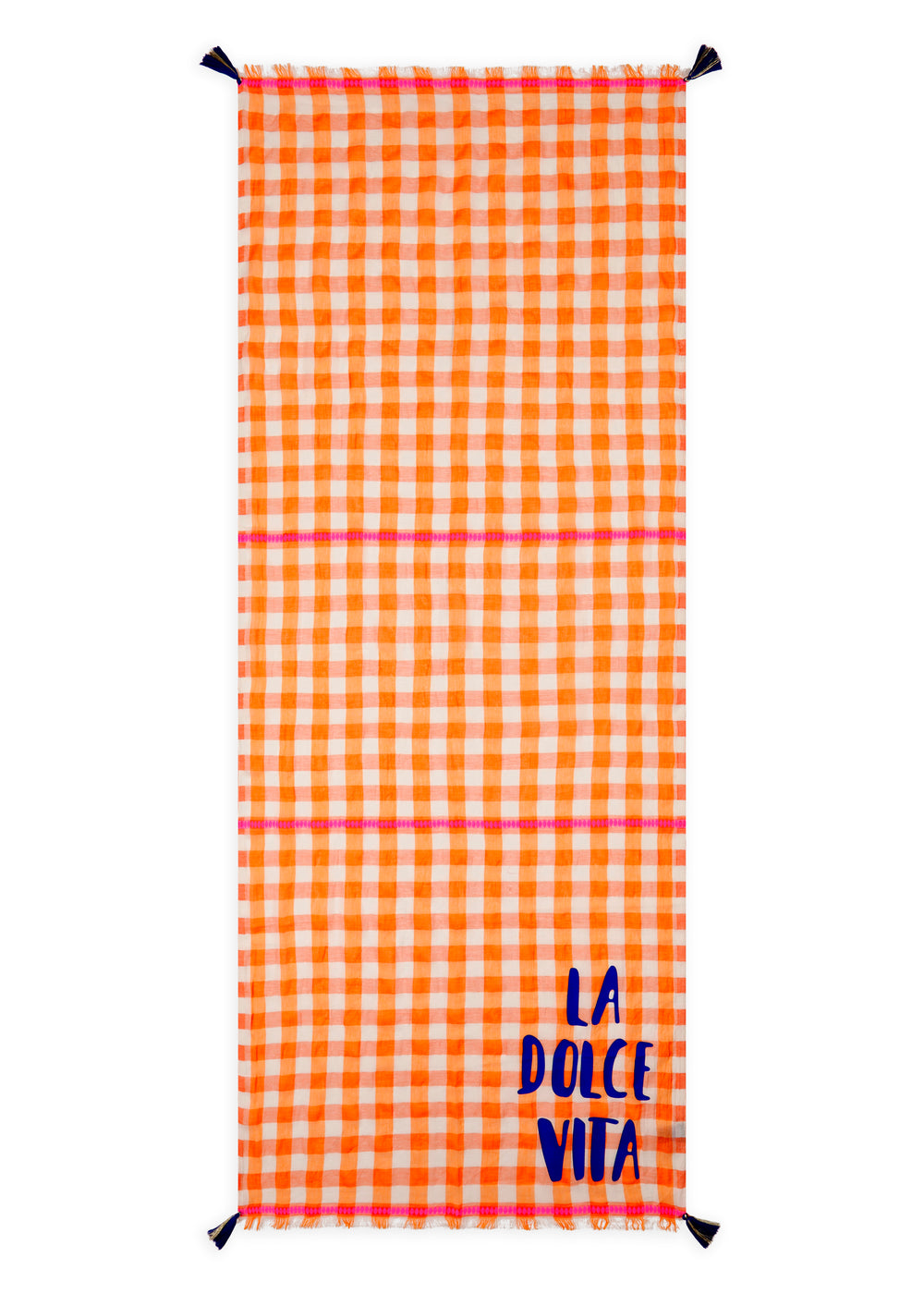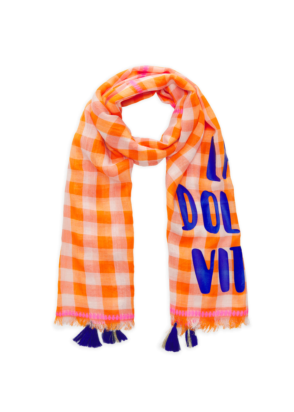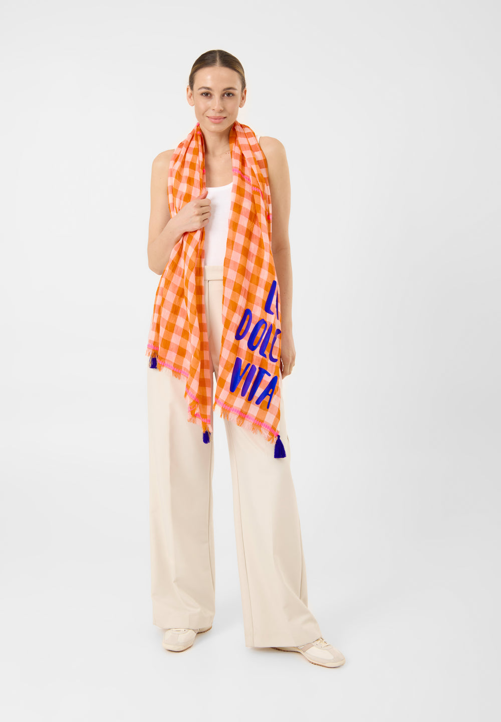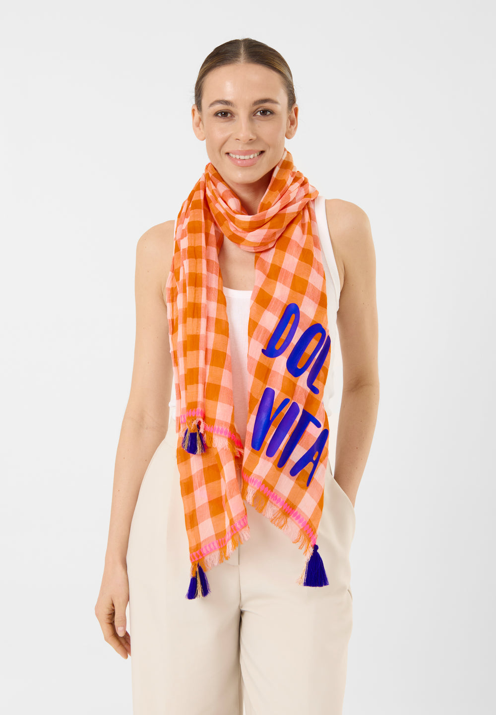 Dieser leichte Schal aus Baumwollmischung zeigt ein Karomuster in Orange und trägt den „LA DOLCE VITA“-Schriftzug in Kontrastfarbe. Die weiche, luftige Qualität sorgt für angenehmen Tragekomfort.