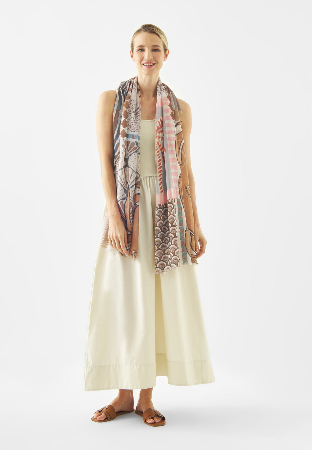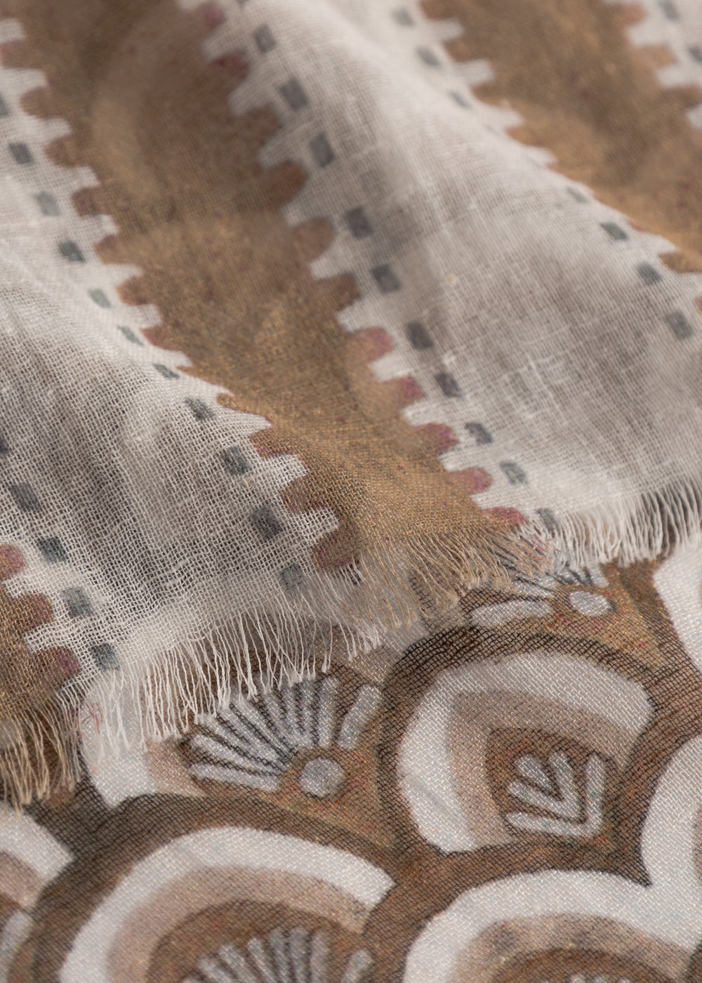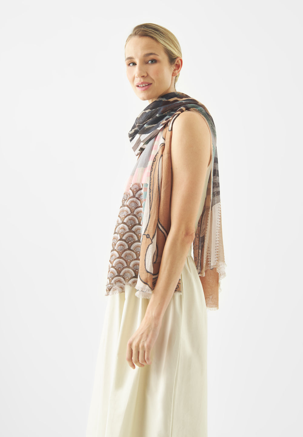 Dieser angenehm leichte und luftige Schal mit Muschel-Motiv und einem Mustermix aus warmen Naturtöten wirkt besonders fashionable, wenn du ihn mit Weiß kombinierst. Die Mischqualität ist perfekt für den Sommer geeignet. Sie vereint die Vorzüge der drei Fasern. Leinen steht für eine edle Optik gepaart mit einer kernigen Griffigkeit. Modalfasern geben dem Schal Weichheit. Der Baumwollanteil sorgt für Lässigkeit und Unkompliziertheit. Der natürliche Kühleffekt und die gute Luftdurchlässigkeit machen den Stoff vor allem bei warmen Temperaturen sehr beliebt.