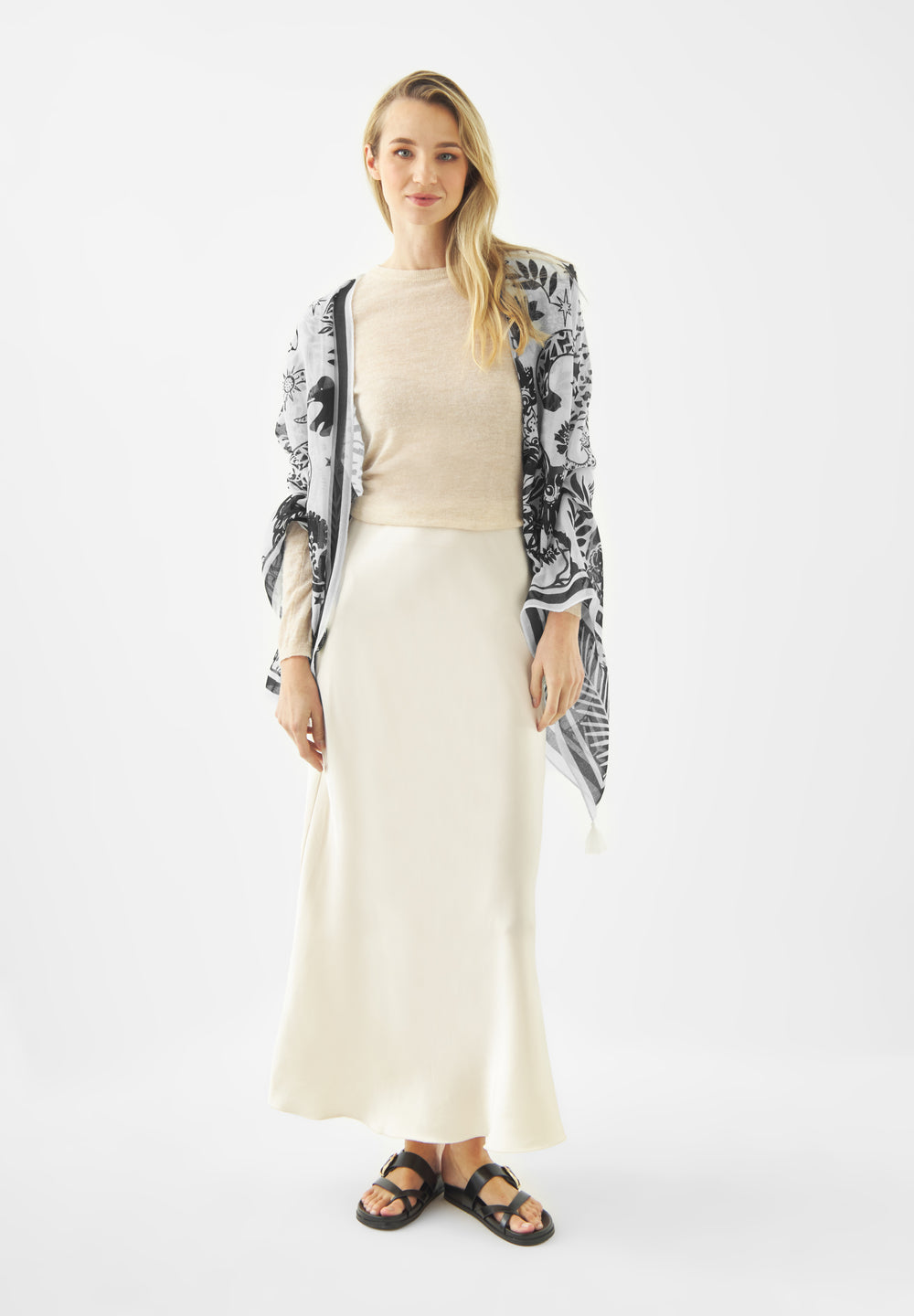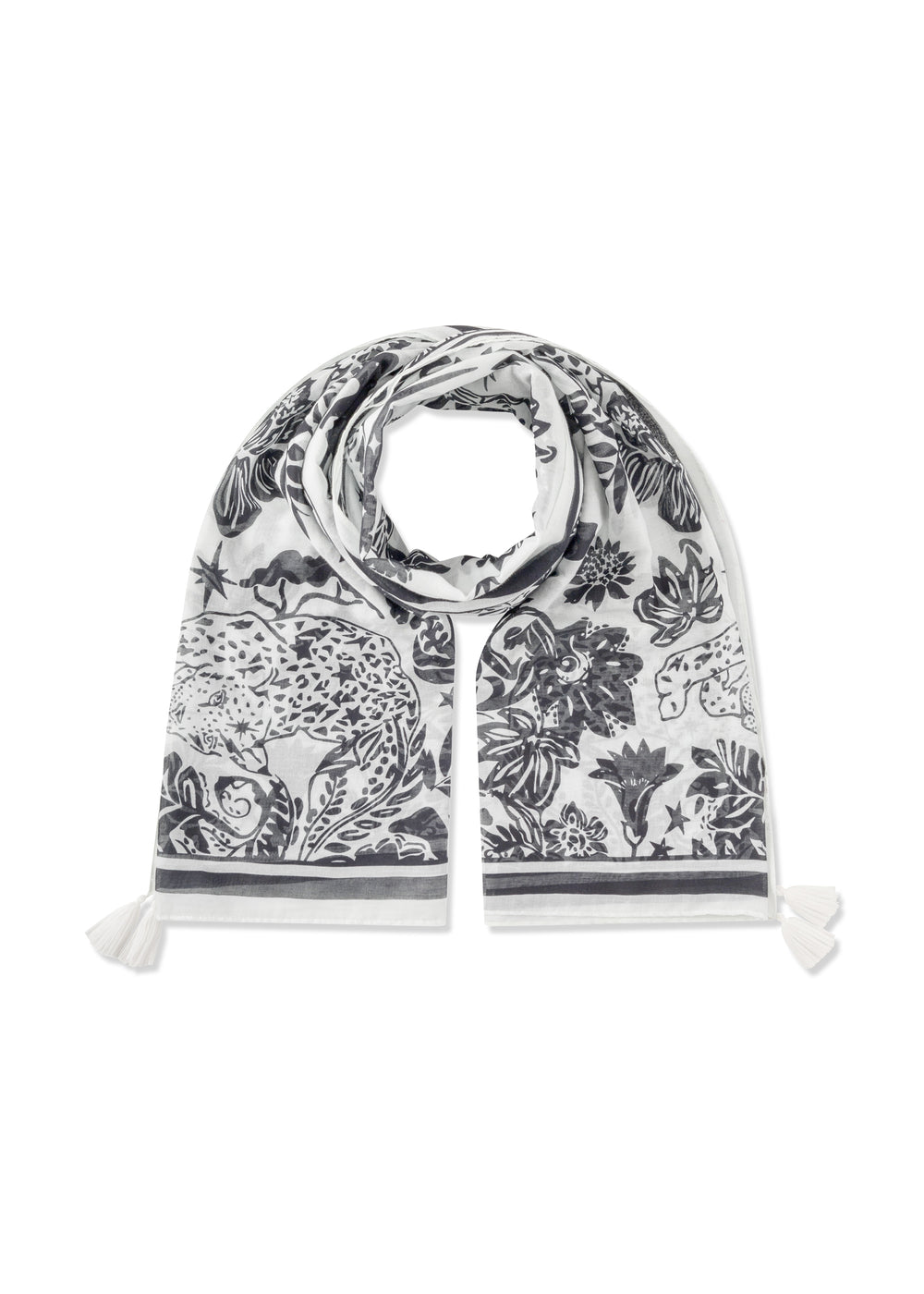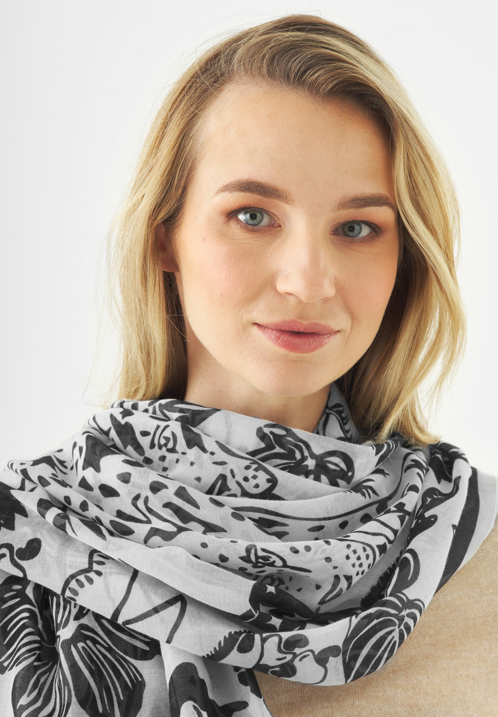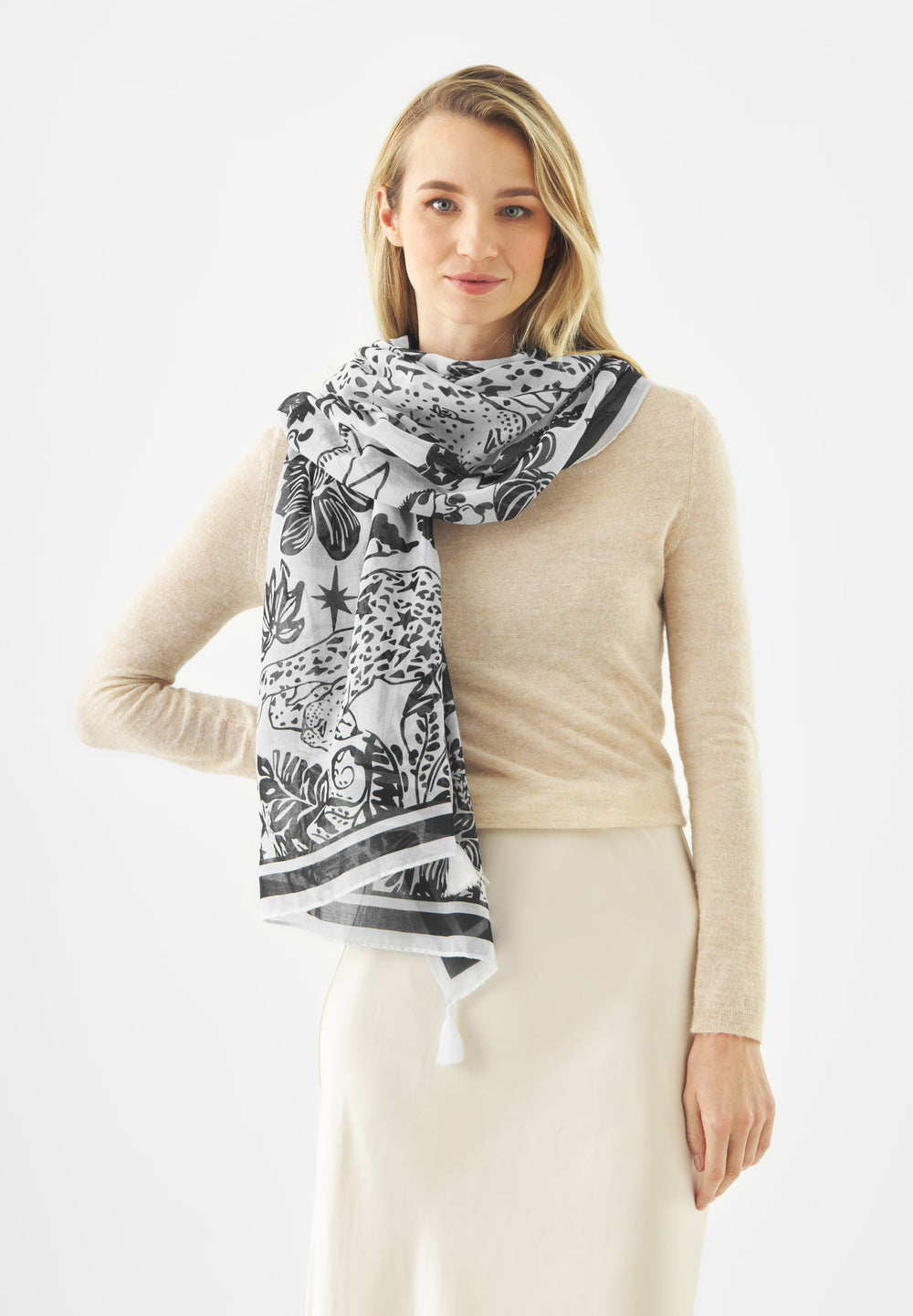 Dieser leichte Schal aus feiner Baumwolle bringt mit seinem Dschungel-Print in schwarz-weiß klassische Sommerfrische in jeden Look. Er passt perfekt zu schlichten Outfits und lässt sich vielseitig stylen – einfach um den Hals oder geknotet als Strandkleid, Pareo oder Sarong-Rock.