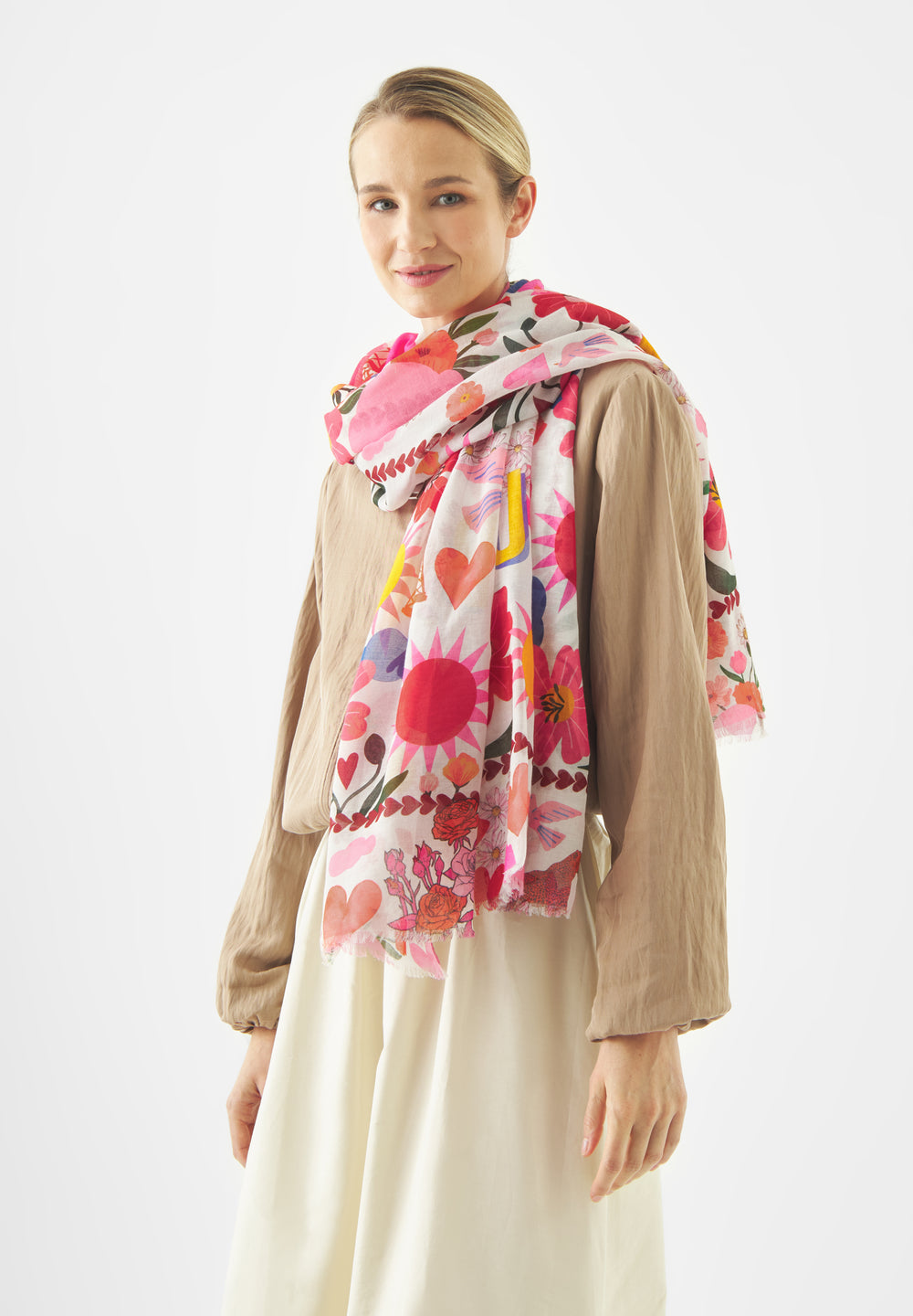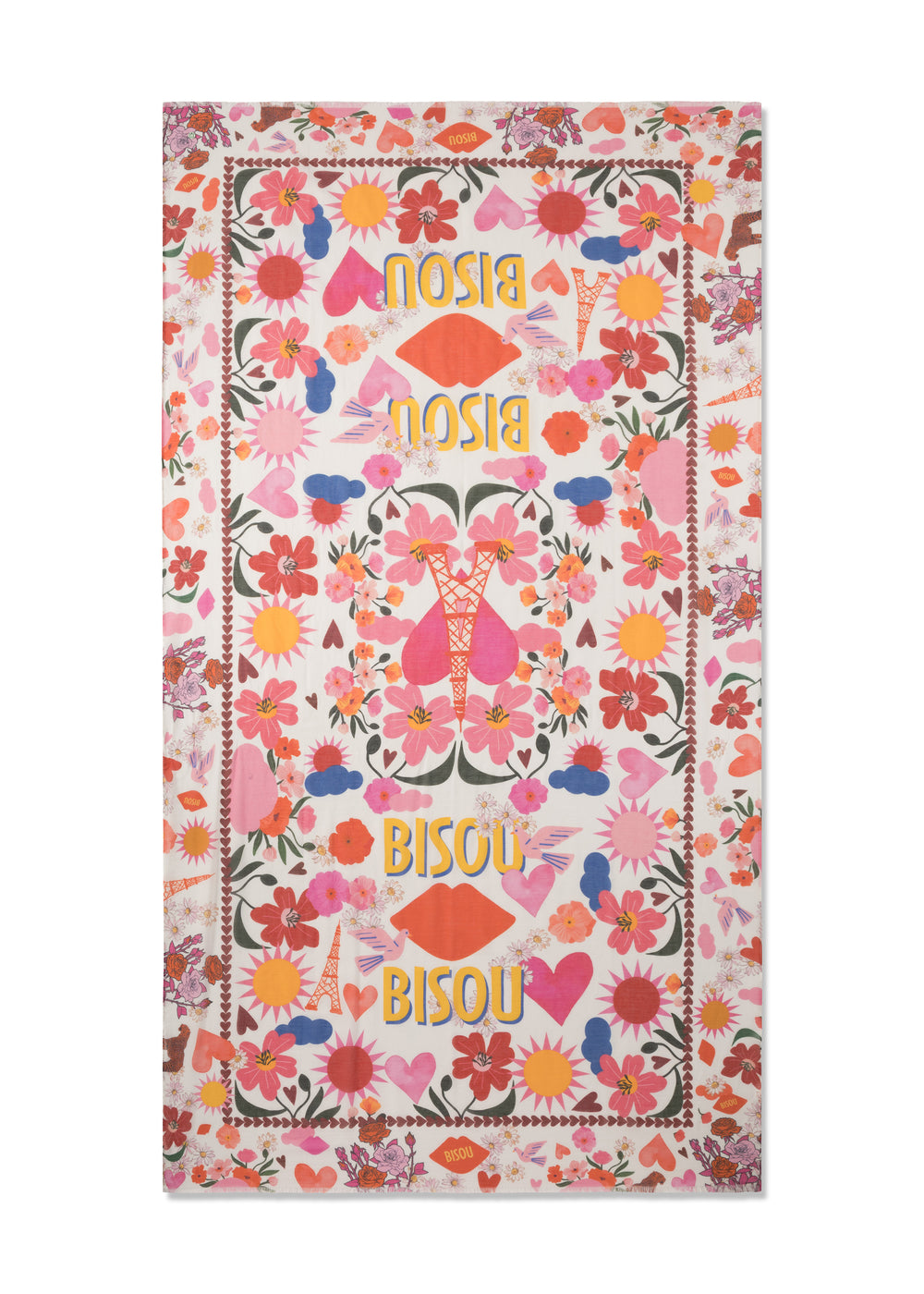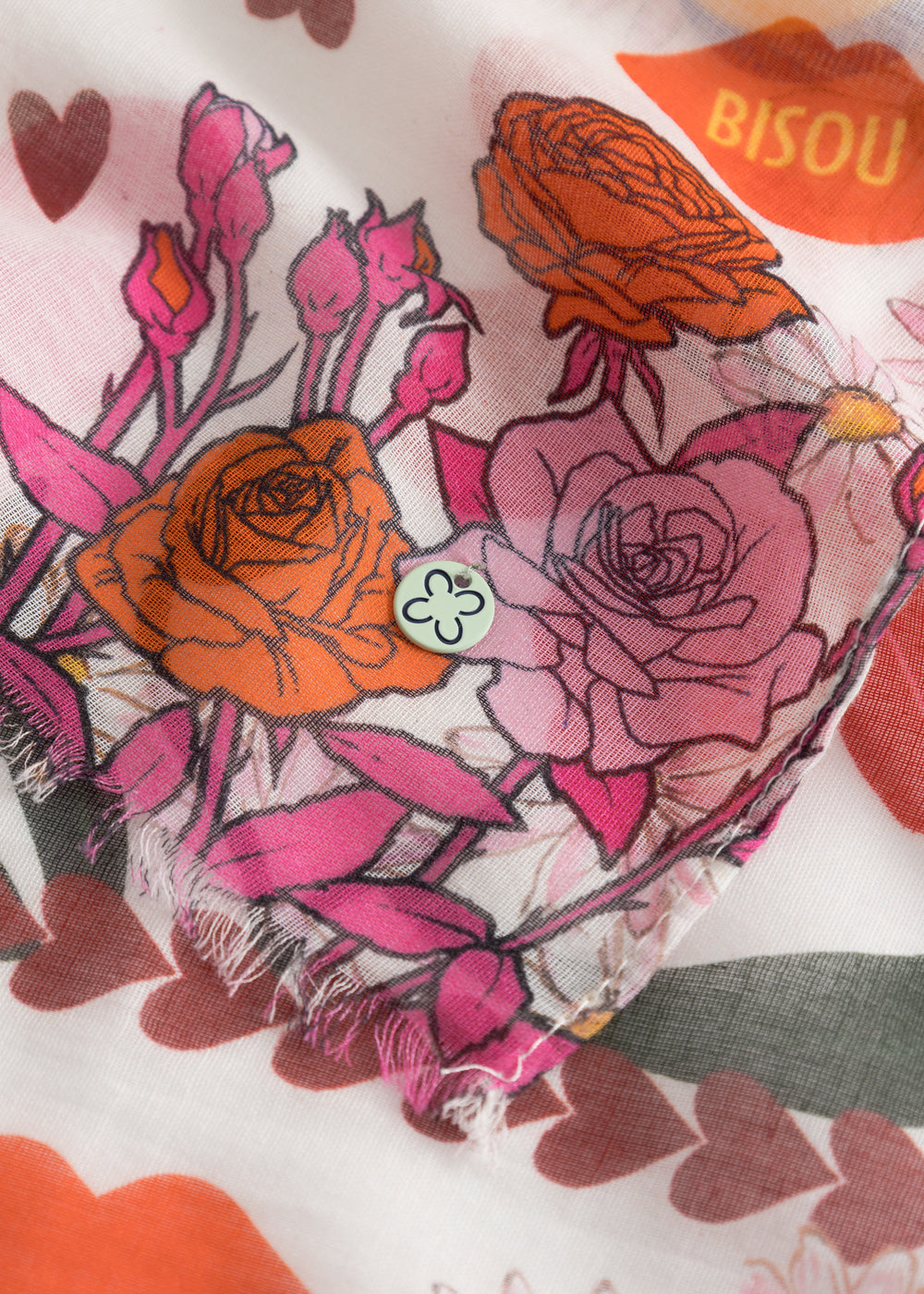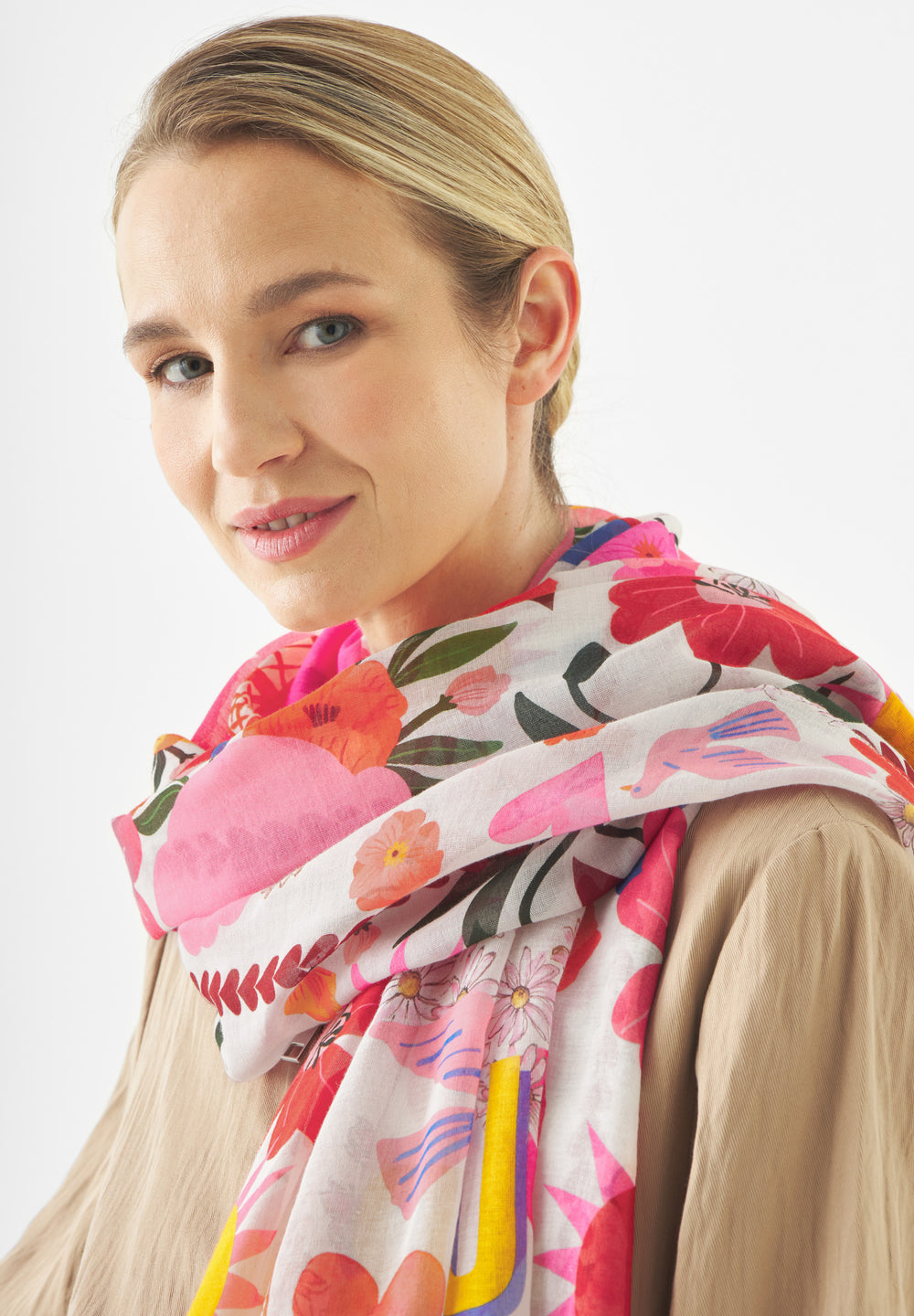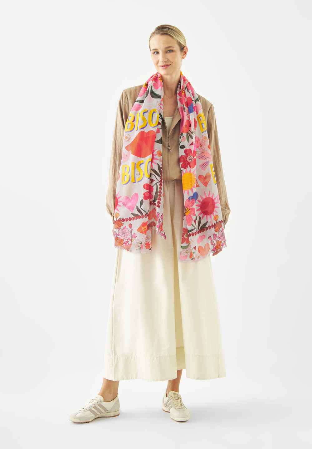 Dieser leichte Schal aus reiner Baumwolle verzaubert mit seinem charmanten Paris-Muster und sommerlichen Farben. Der weiche, luftige Stoff trägt sich angenehm und bringt eine frische, verspielte Note in jeden Look. Ein vielseitiges Accessoire, das schlichte Outfits aufhellt und deinem Stil einen Hauch französischer Leichtigkeit verleiht.