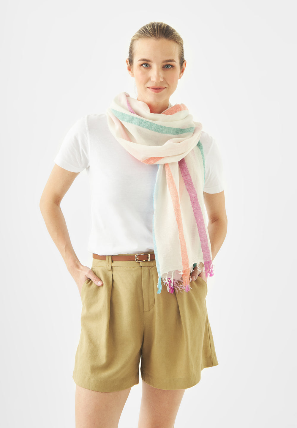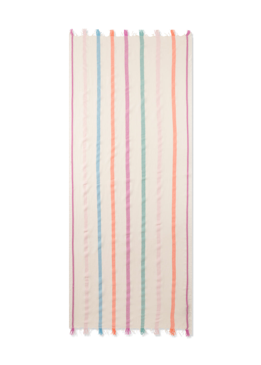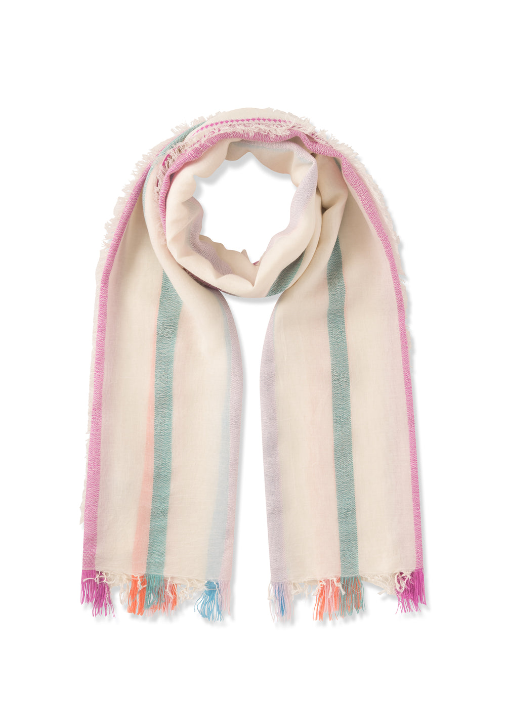 Dieser weiche Schal aus hochwertigem Baumwollmix bringt Farbe und Leichtigkeit in den Alltag. Das feine Streifenmuster wirkt modern, der leichte Stoff fällt locker und wird durch feine Fransenabschlüsse lässig abgerundet. Ein unkompliziertes Accessoire mit softem Griff – vielseitig kombinierbar, jeden Tag.