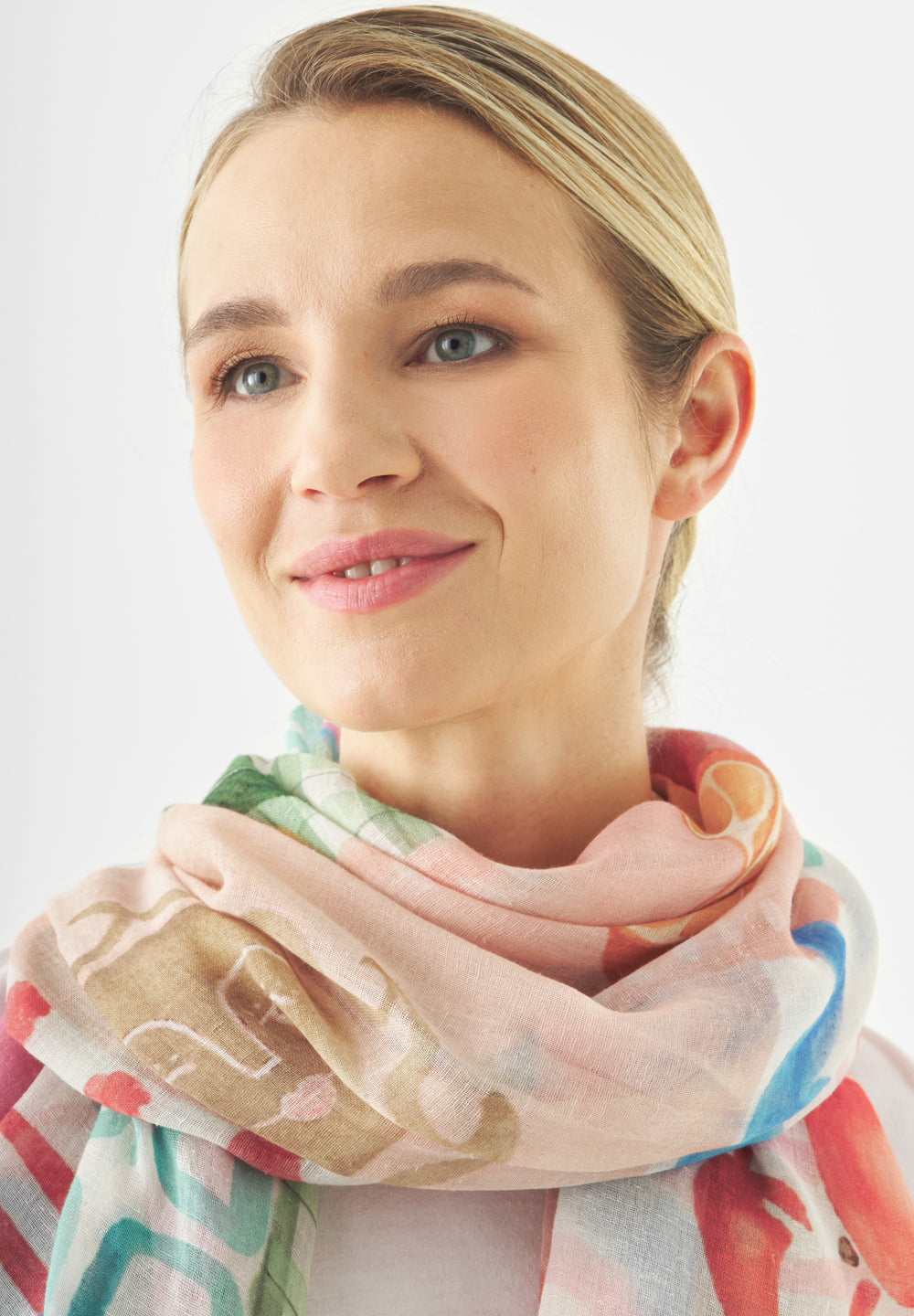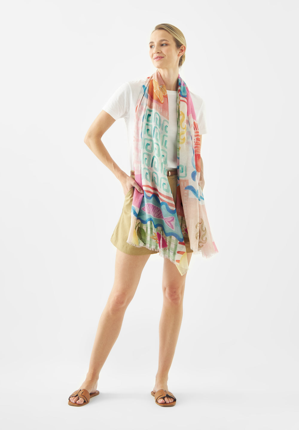 Dieser angenehm leichte und luftige Schal aus Baumwolle, Modal und Leinen ist perfekt für warme Tage. Sein sommerlich bunter Mustermix mit lebendigem, von Sonne und Natur inspiriertem Print wirkt besonders fashionable, vor allem in Kombination mit Weiß.