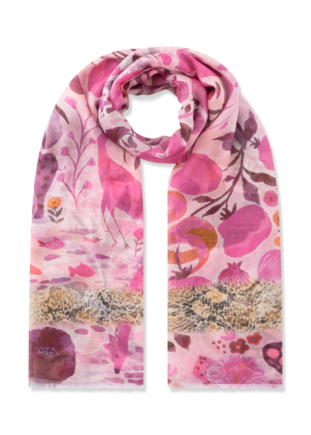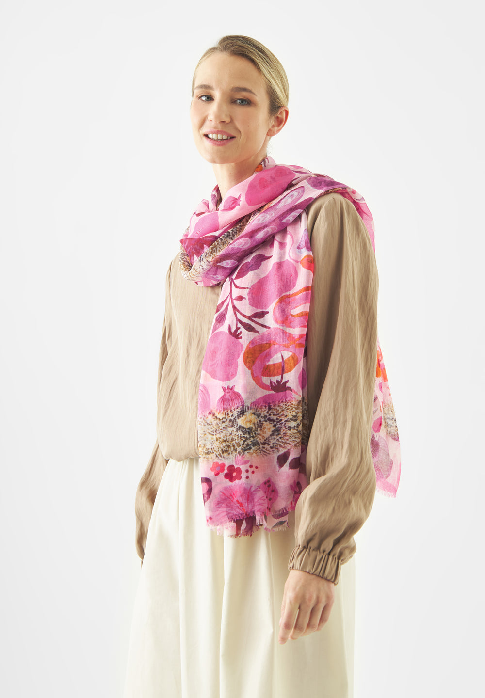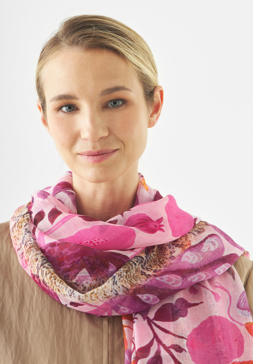 Dieser softweiche Schal aus edler Seide und Modal stimmt perfekt auf den Sommer ein. Mit seinen Dschungel-Motiven in pink und beige ergänzt er sowohl leichte Sommerlooks als auch entspannte Beach-Outfits. Unsere Silky-Modal-Qualität vereint angenehme Weichheit mit dem edlen Glanz und der Farbbrillanz von Seide.