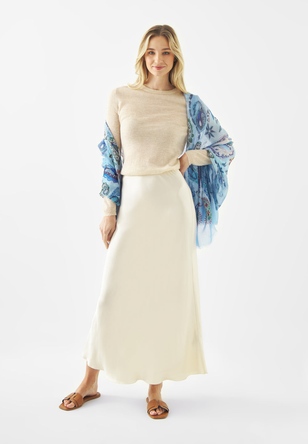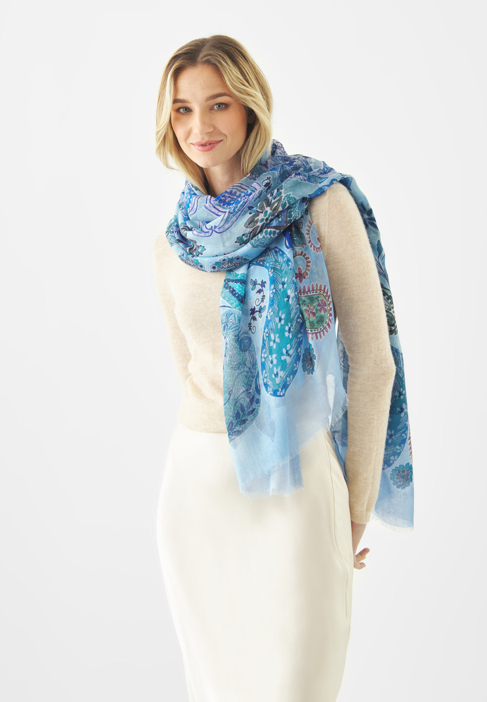 Dieser softweiche Schal aus edler Seide und Modal ist der perfekte Begleiter für den Sommer. Das Paisleymuster in Blau-, Grün- und Erdtönen verleiht leichten Looks und Beach-Outfits eine elegante Note. Unsere Silky-Modal-Qualität verbindet die Weichheit von Modal mit dem edlen Glanz und der Farbbrillanz von Seide.