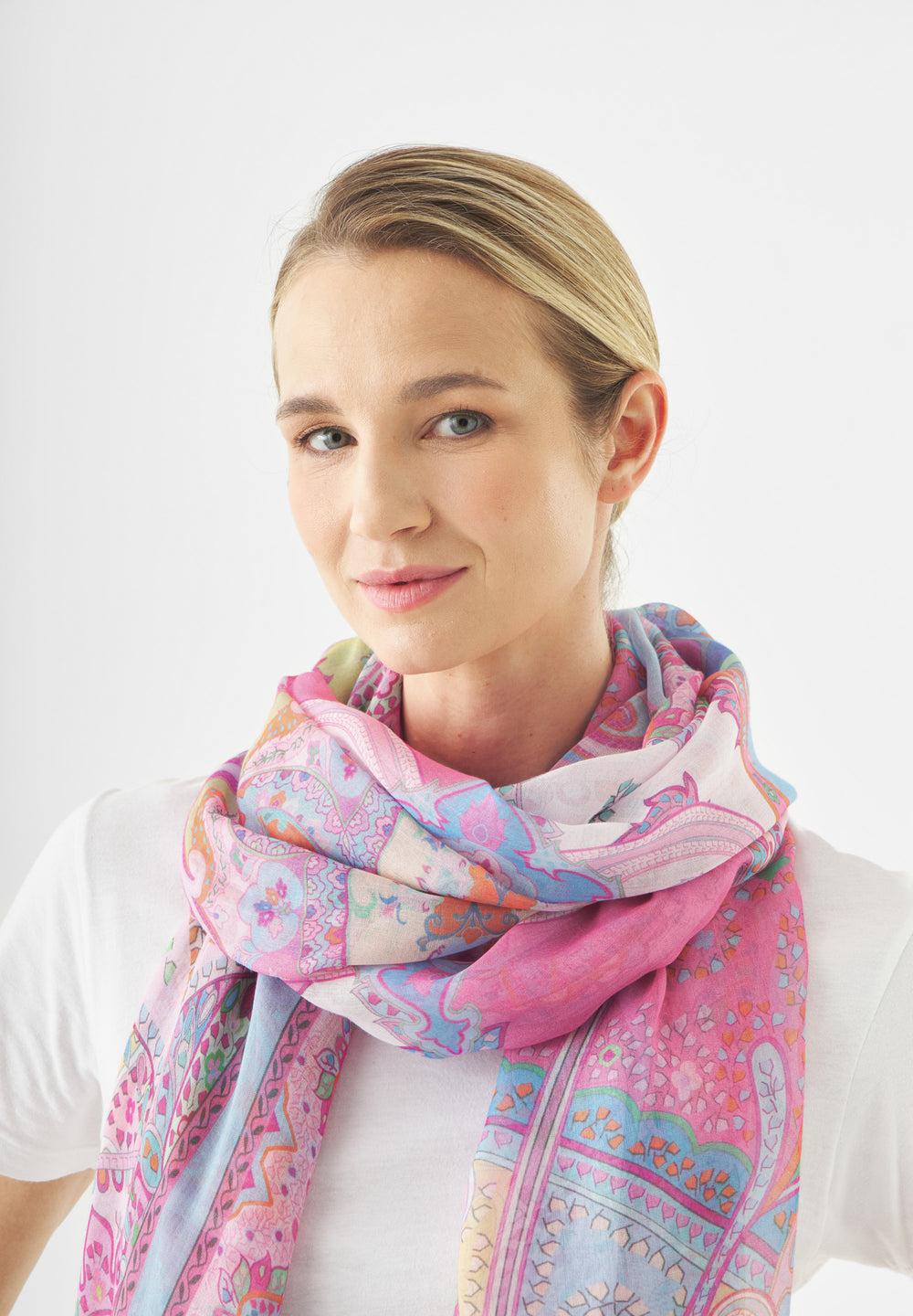 Dieser feine und softweiche Schal aus edler Seide und Modal stimmt wunderbar auf den Sommer ein. Mit seinem modern interpetiertem Paisleymuster in Pinktönen passt der Schal zum weißen Sommerkleid ebenso gut wie zum lässigen Beach Outfit. Der Schal wurde aus unserer hochwertigen Silky-Modal-Qualität gefertigt. Sie vereint die Vorzüge von Modal und Seide. Modal ist weich, fließend und knittert wenig. Seide hat einen natürlichen Glanz und steht für leuchtende Farben.
