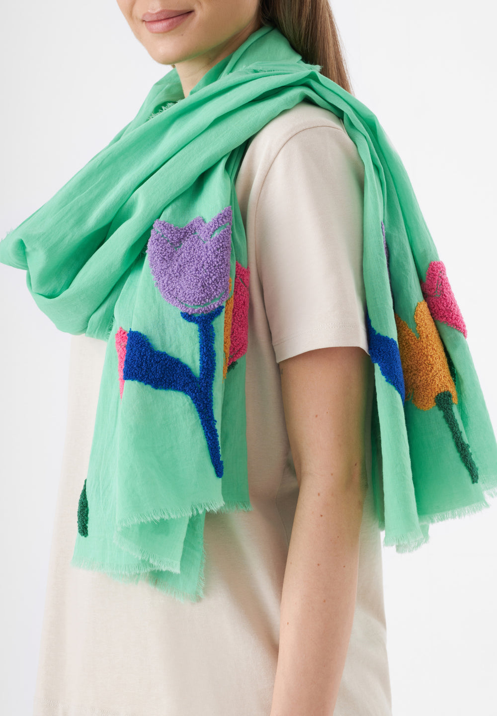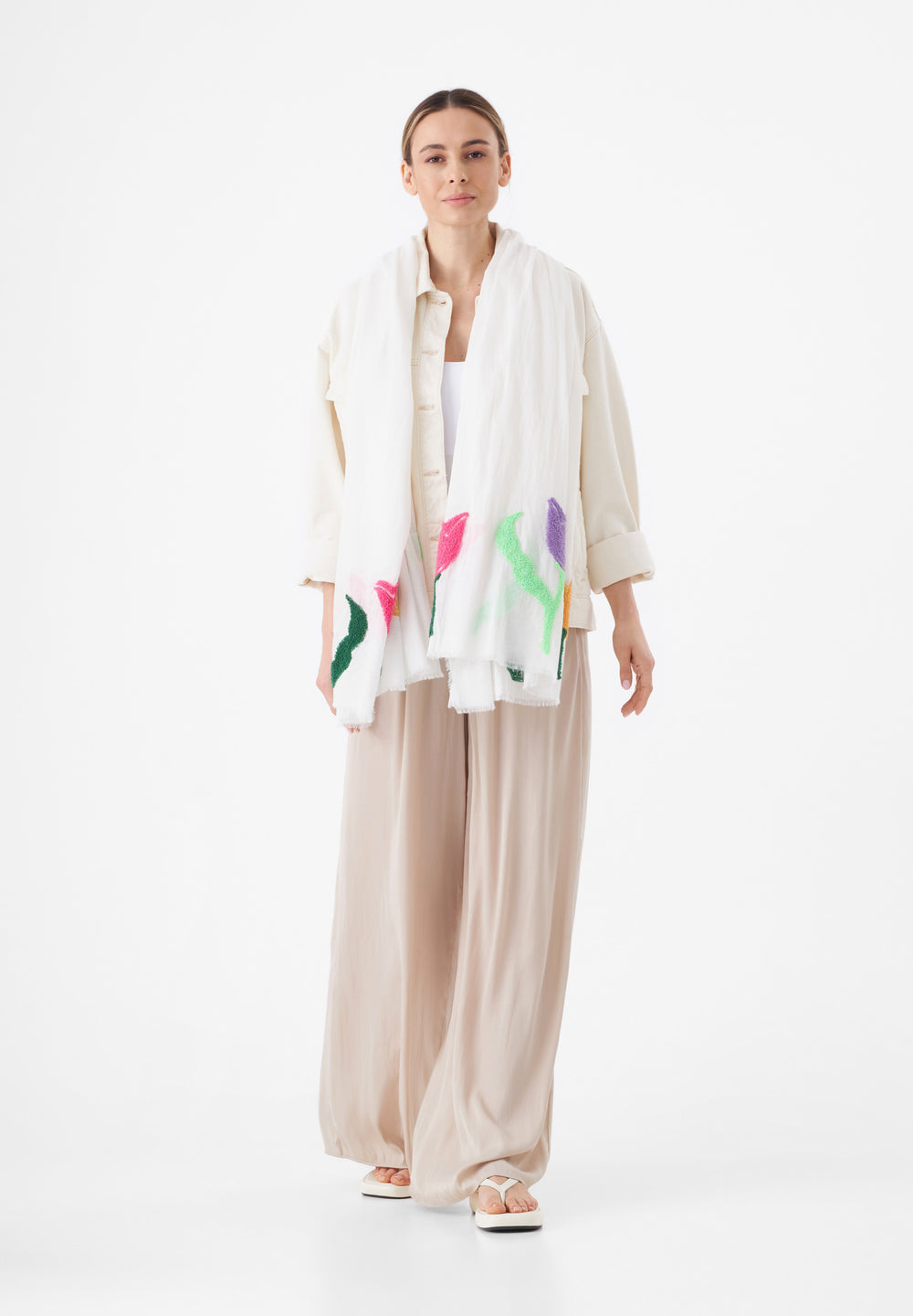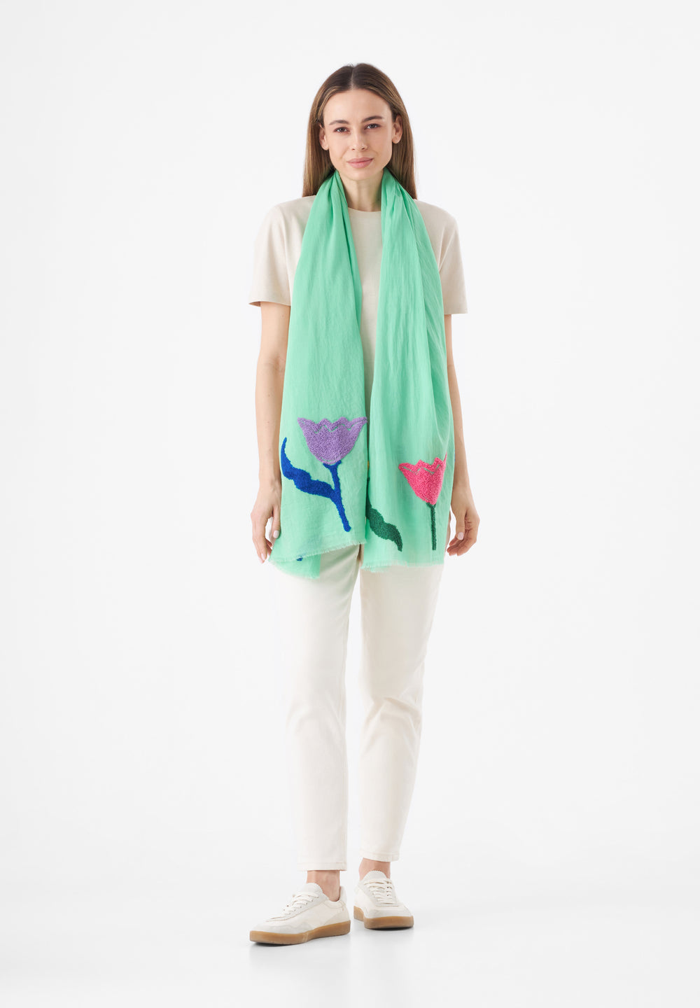 Leichter Schal aus reiner Baumwolle mit aufgestickten Blumen