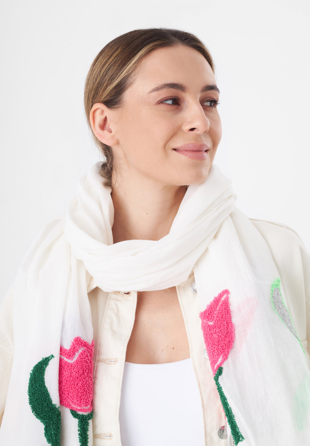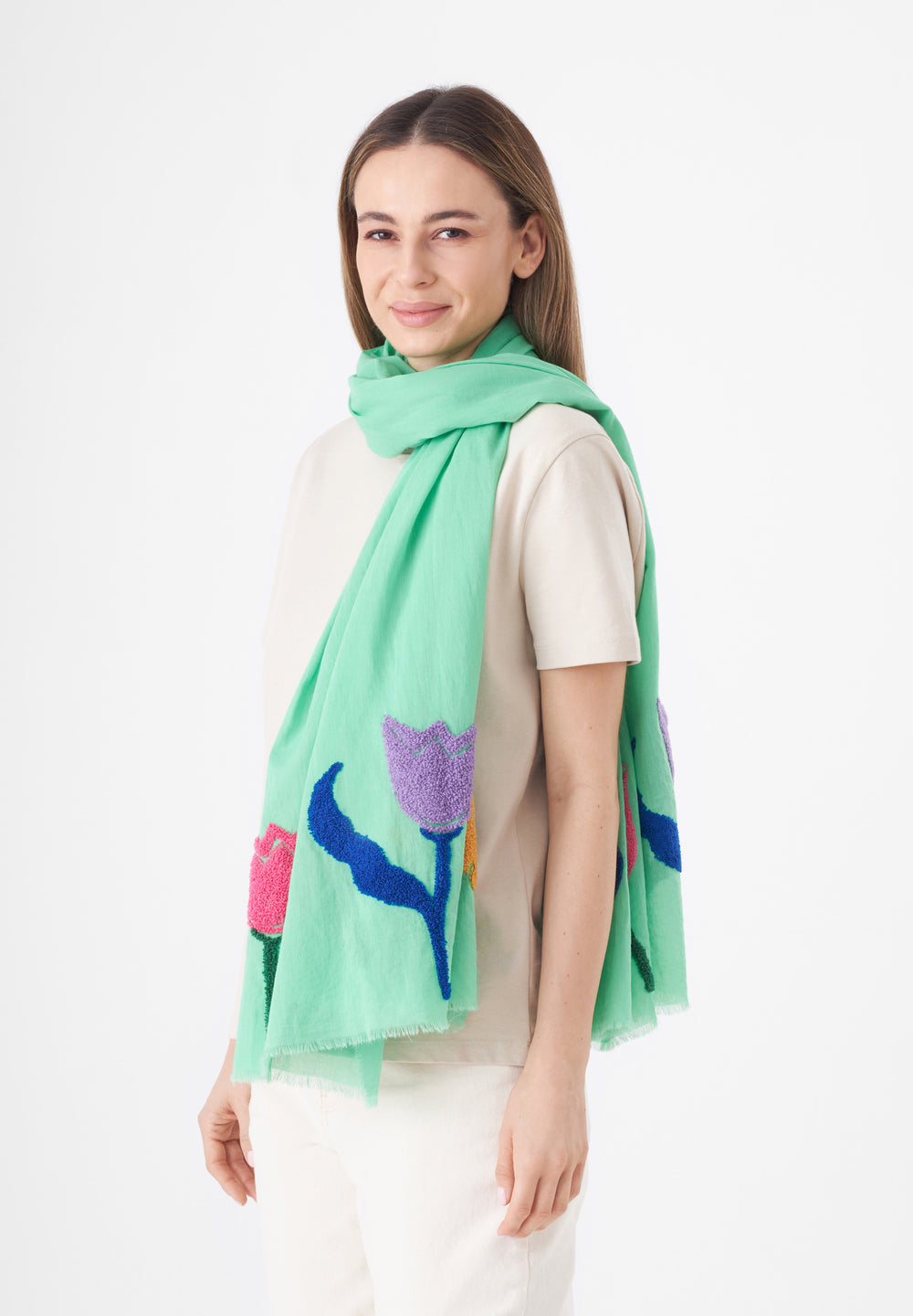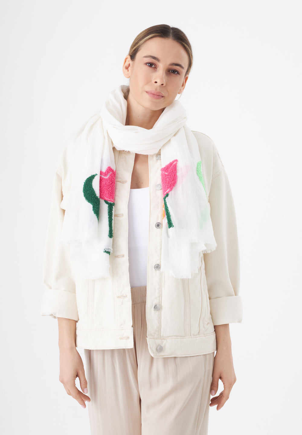 Leichter Schal aus reiner Baumwolle mit aufgestickten Blumen