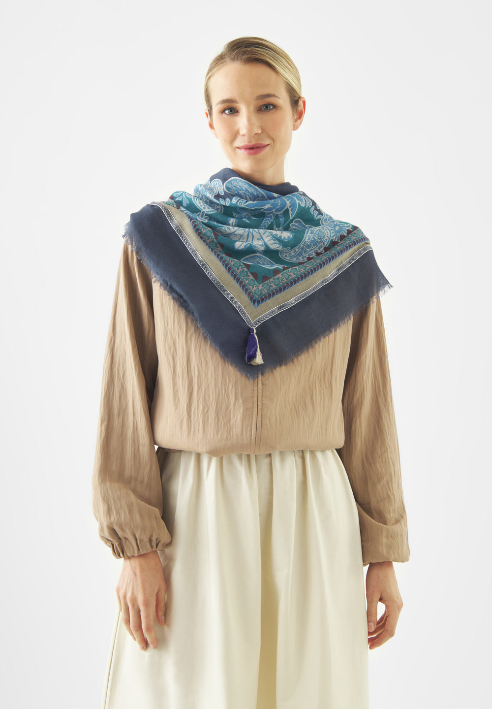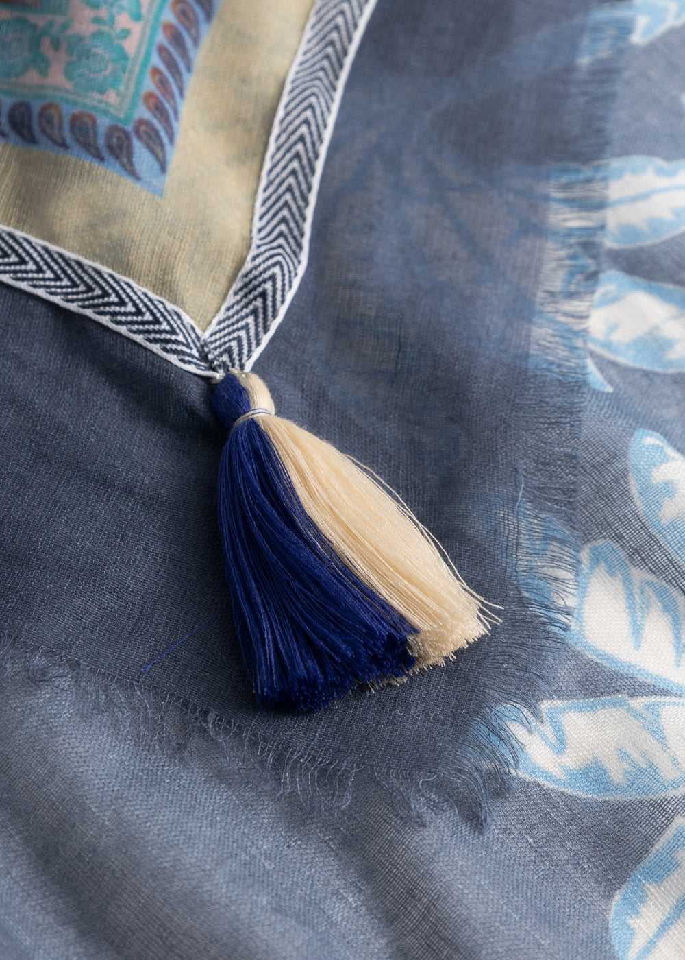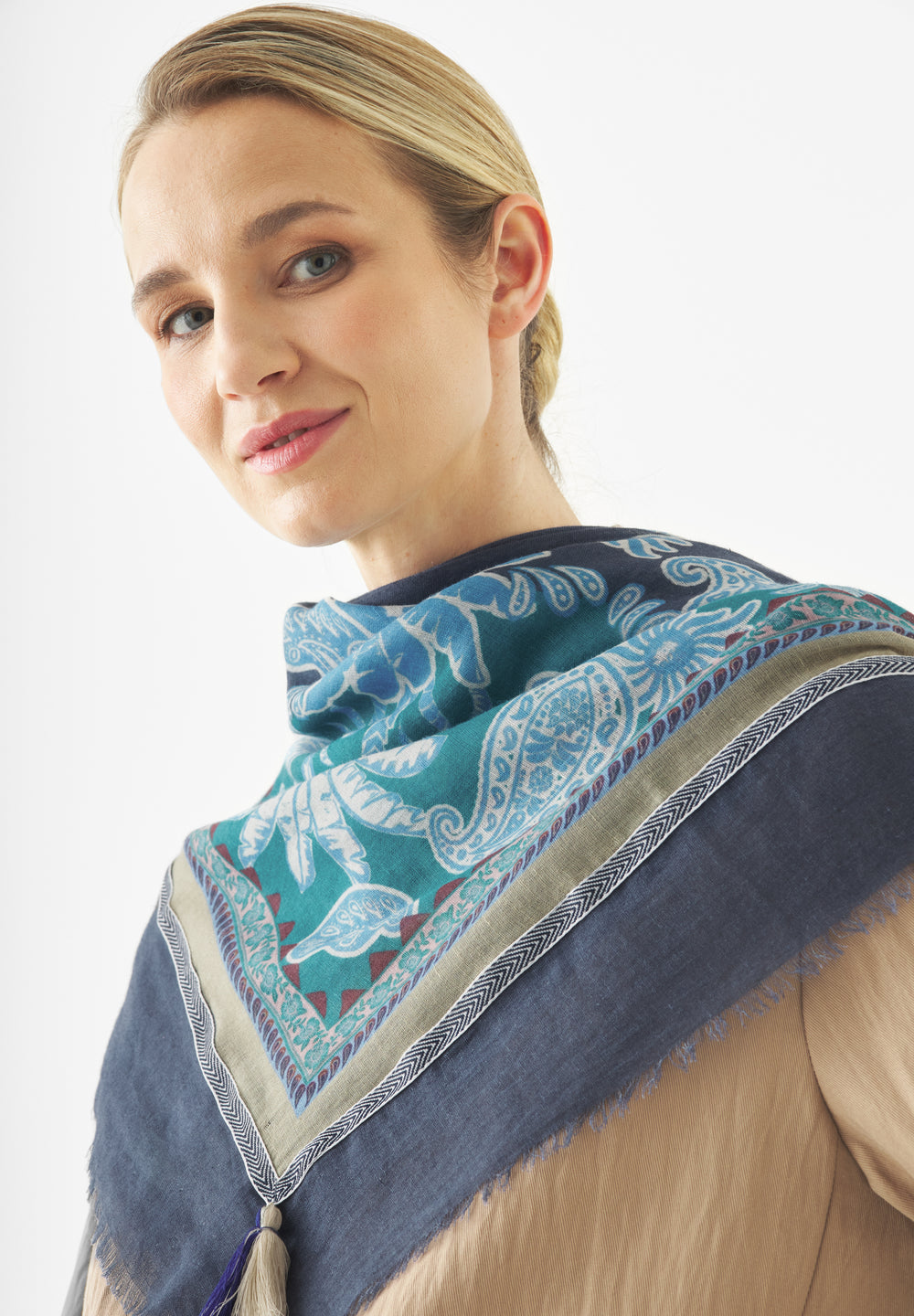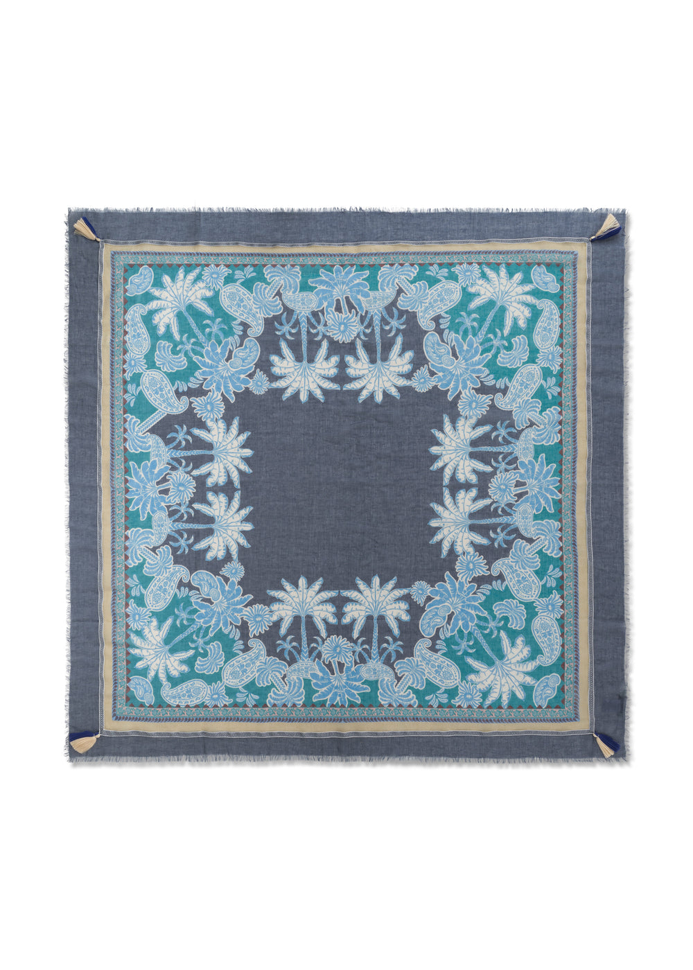 Dieses luftige Tuch mit sommerlichen Palmenmotiven in Shades of Blue and Neutrals wirkt besonders stylish in Kombination mit Weiß. Die leichte Mischung aus Baumwolle, Modal und Leinen ist ideal für warme Tage: Leinen verleiht eine edle Note, Modal sorgt für Weichheit und Baumwolle für lässigen Komfort mit angenehm kühlendem Effekt.