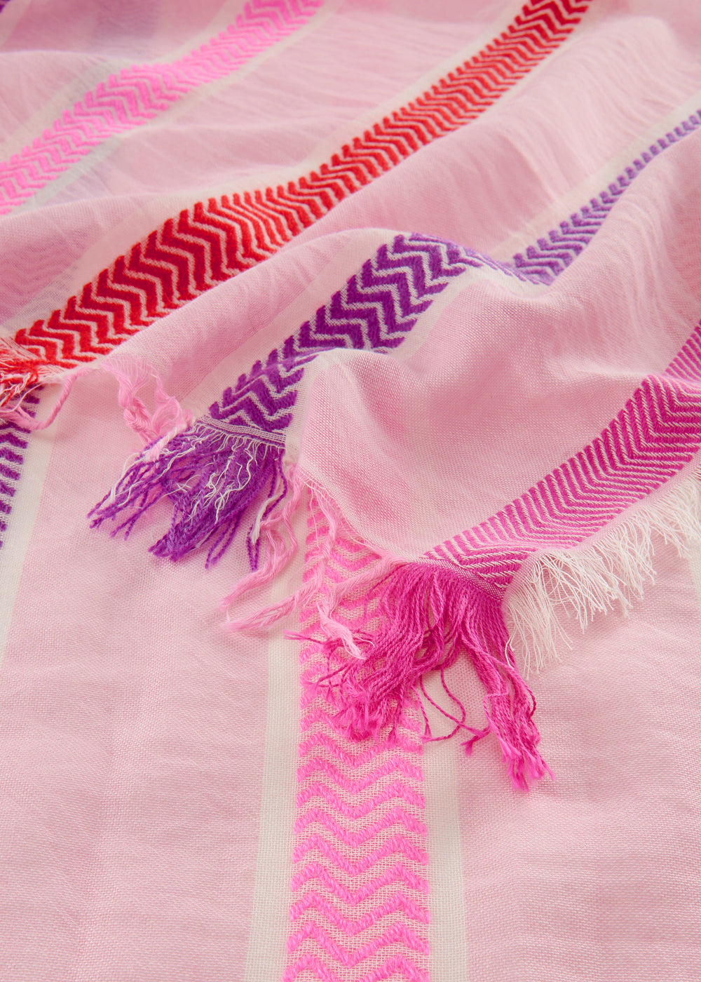 Dieser stylische Streifenschal gehört zu den Hinguckern der neuen Sommer-Kollektion. Ob lässig über die Schulter geworfen, zum weißen Sommerkleid um die Taille gebunden oder als Pareo am Beach getragen – Trendsetter machen aus ihm ein Statement-Stück. Der Schal wurde aus sommerlicher Baumwolle und feiner Acrowolle gewebt. Er ist angenehm leicht, zart transparent und besticht durch seinen handwerklichen Look.