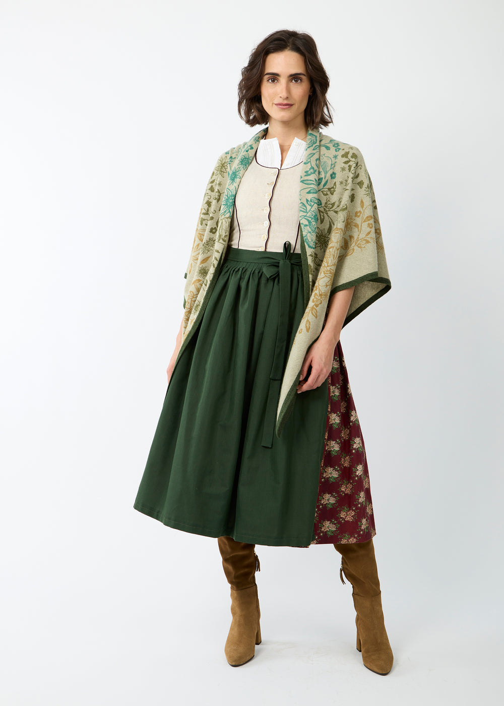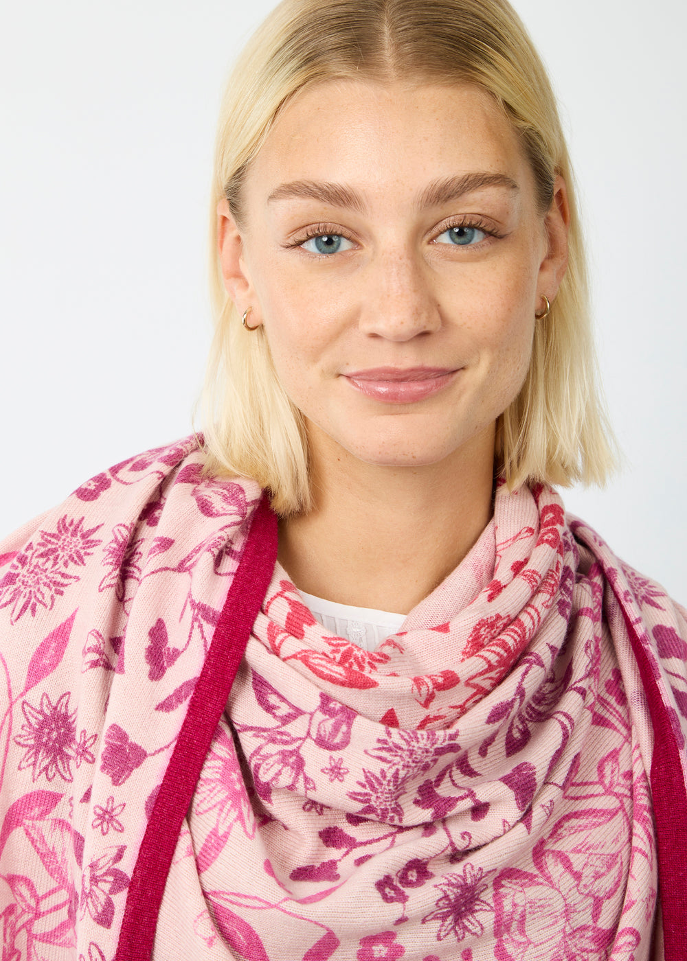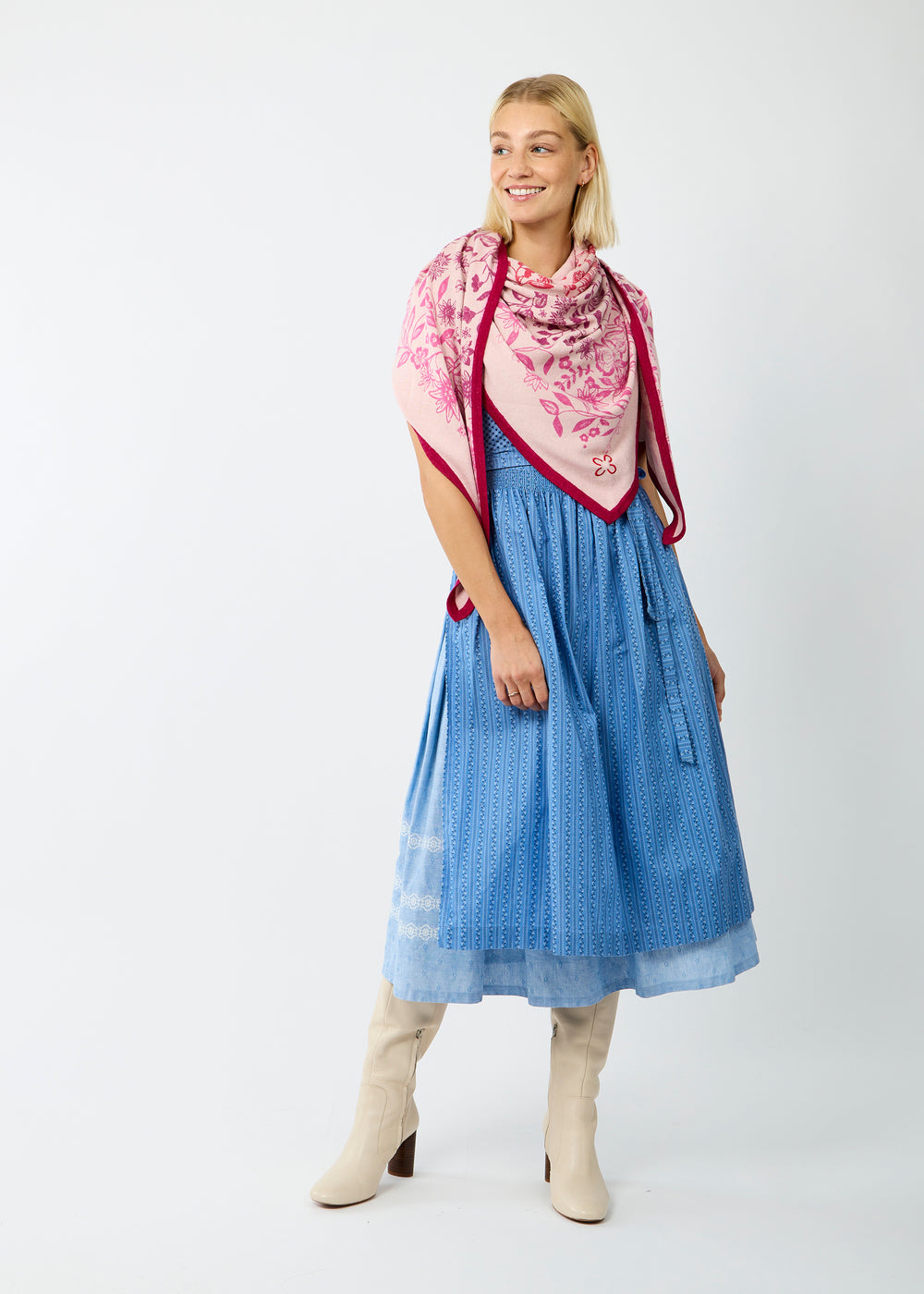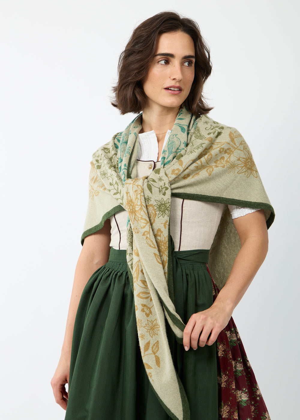Dieses exklusive Triangle-Tuch aus kaschmirweichem Edel-Strick sieht auch als Trachten-Accessoire zum Dirndl und Janker super aus. Im Alltag gefällt es uns lässig zu Jeans- oder Lederjacken kombiniert besonders gut. Das Dreieckstuch ist mit einem handgedruckten Blumen-Motiv aus unserer wertvollen #11 CASHMERE FEELING gefertigt. Hierbei handelt es sich um eine hochwertige Mischung aus Wolle, Kaschmir, Viskose und Polyamid, die mit einem wunderbar weichen Griff und einer edlen Optik überzeugt. Das Triangle ist mit einer umlaufenden Kontrastbordüre dekorativ verziert.