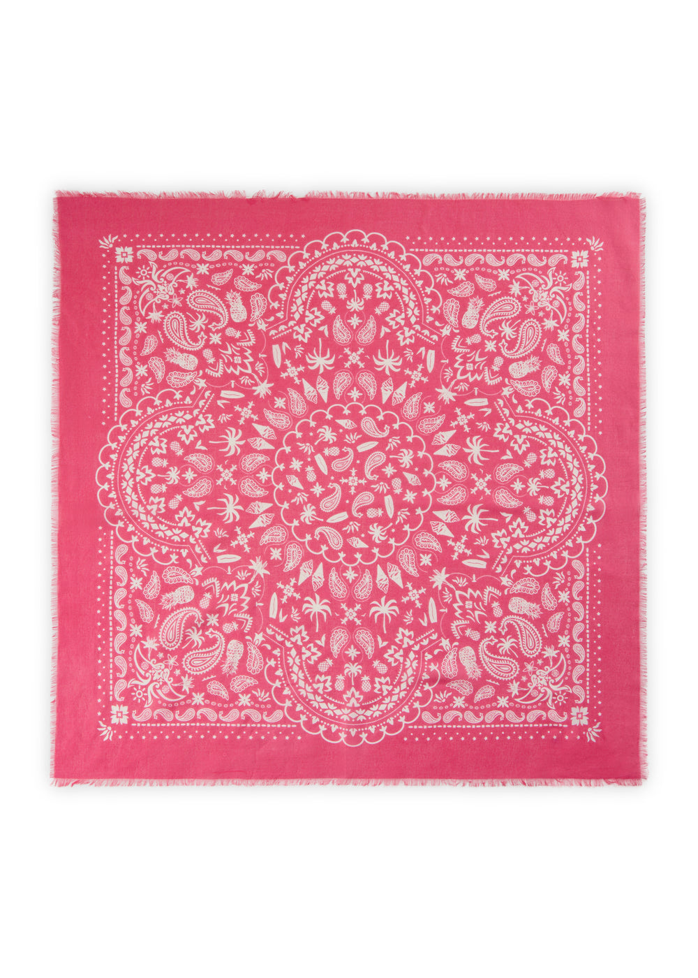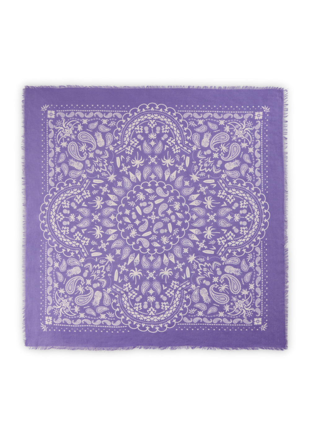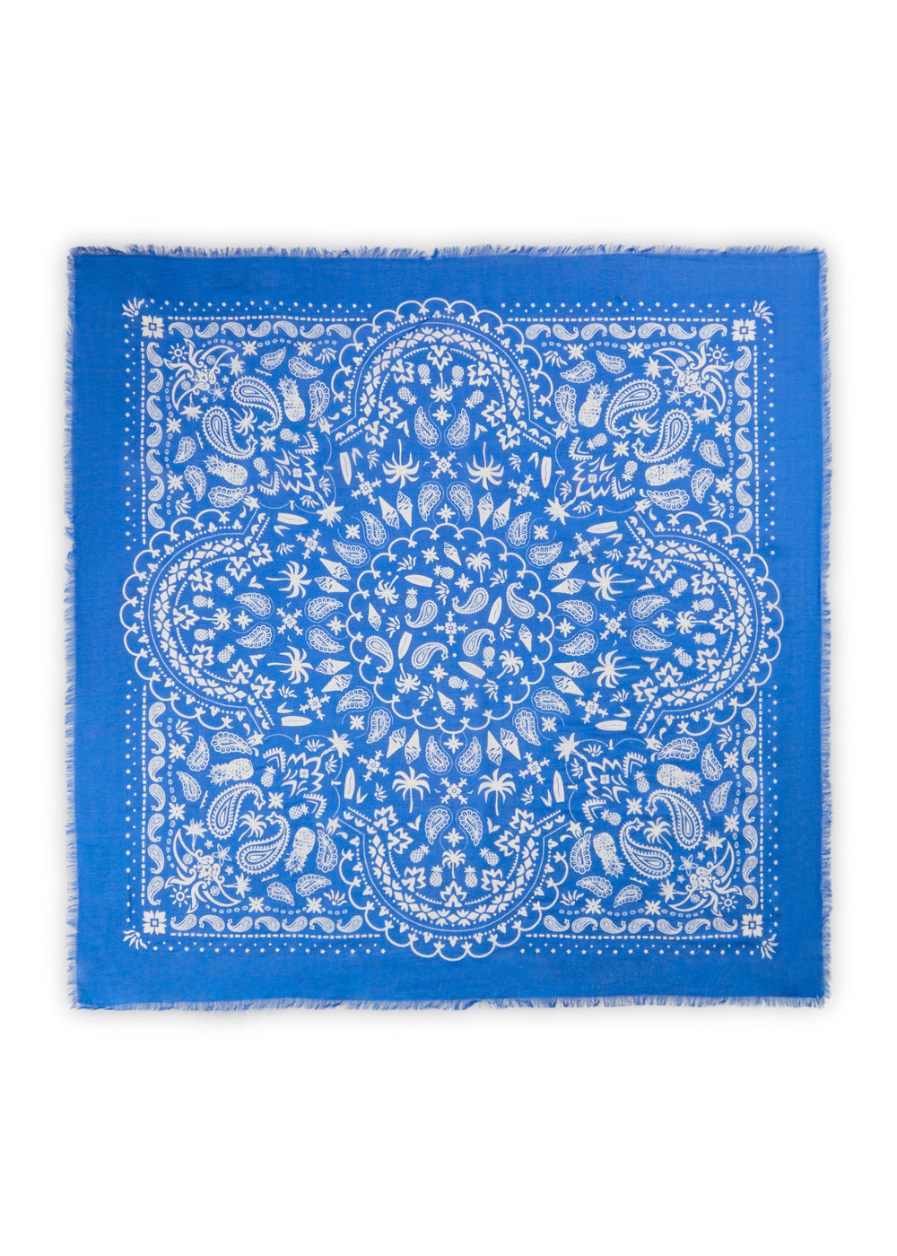 Dieses stylische Carré aus einem soften Modal-/Baumwoll-Mix verbindet klassischen Bandana-Charme mit liebevoll verspielten Details: In das weiße Paisley-Muster auf tiefem Blau sind sommerliche Motive wie Softeis, Palmen, Ananas und Surfbretter eingearbeitet – dezent, charmant und absolut einzigartig.